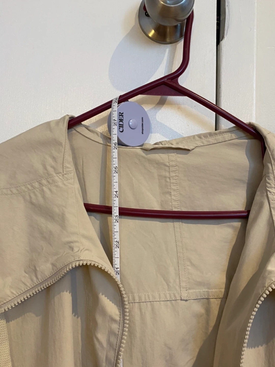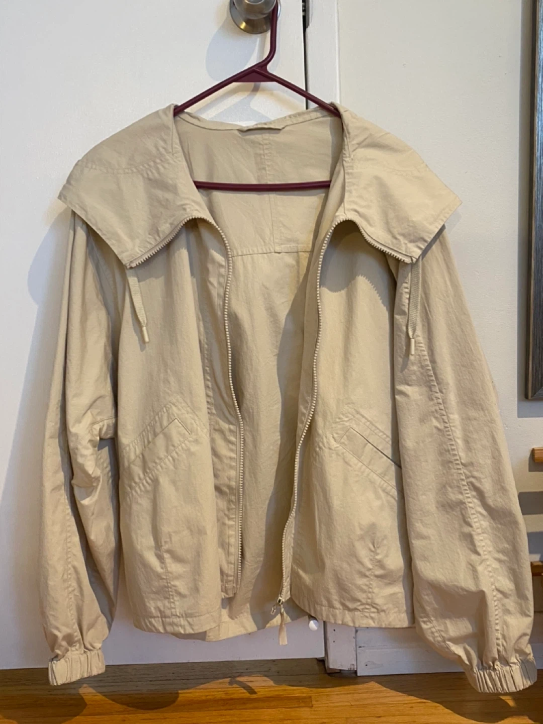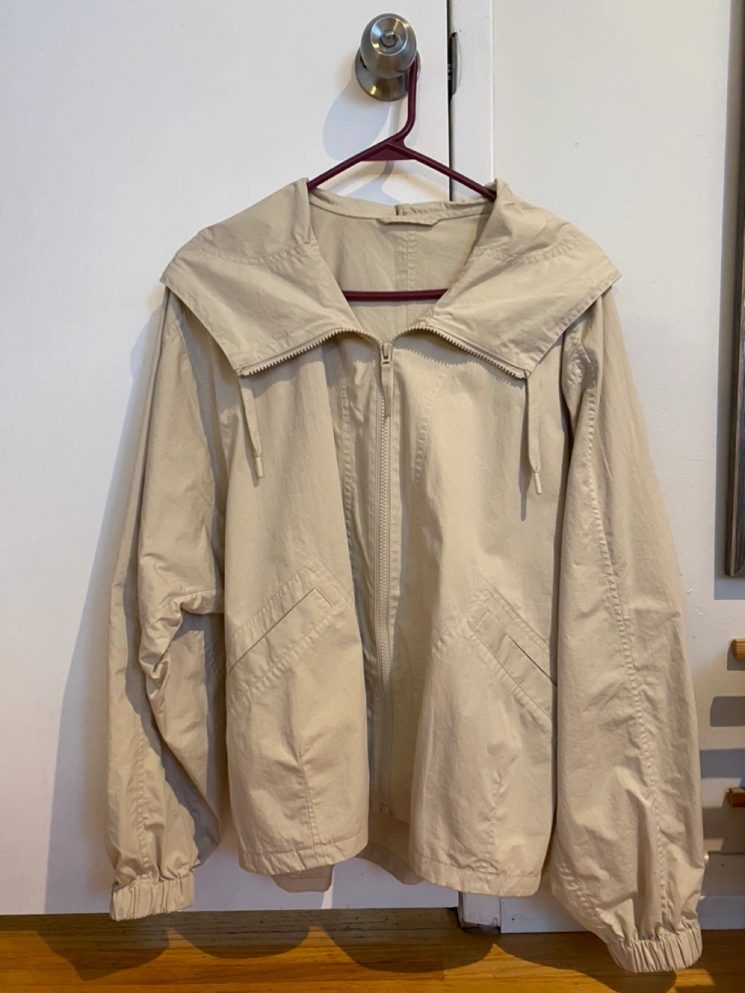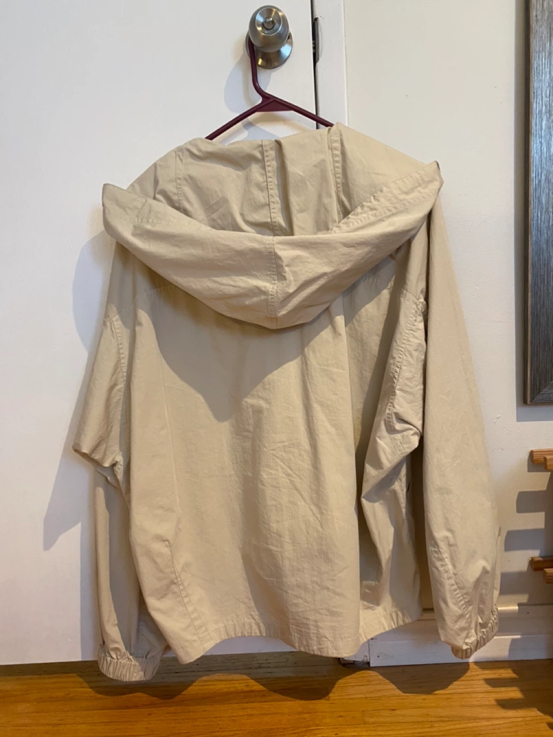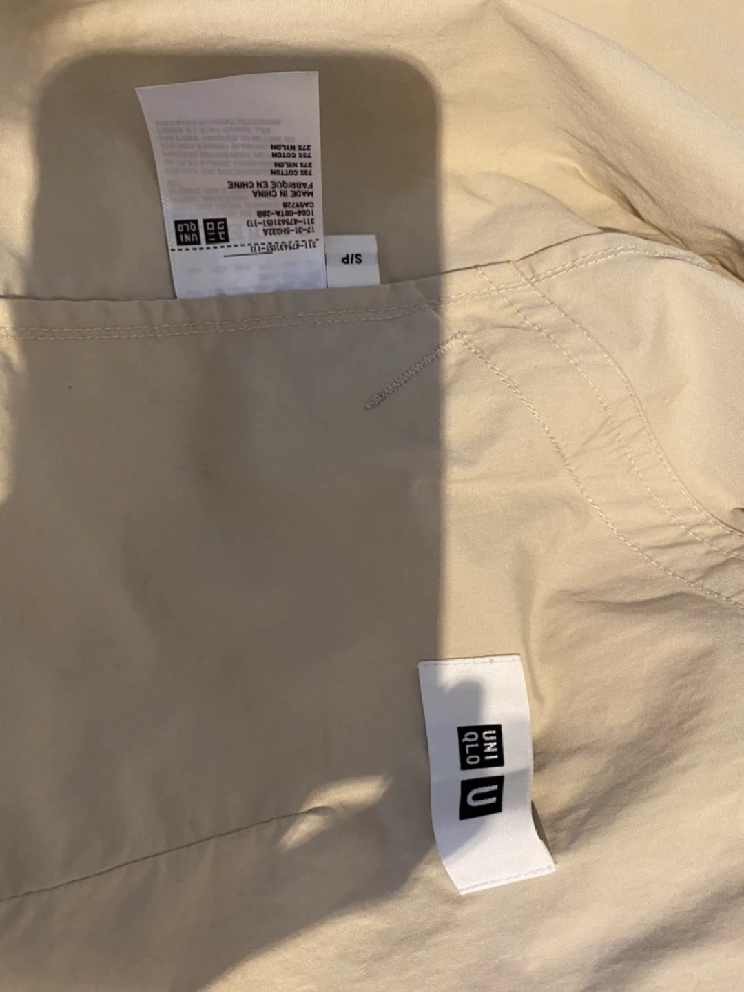 This is a beige UNIQLO hooded jacket with a zip-up front and elastic cuffs. It's made from 73% nylon and 27% cotton. The size is S. It's a great material-lightweight layer for breezy days!