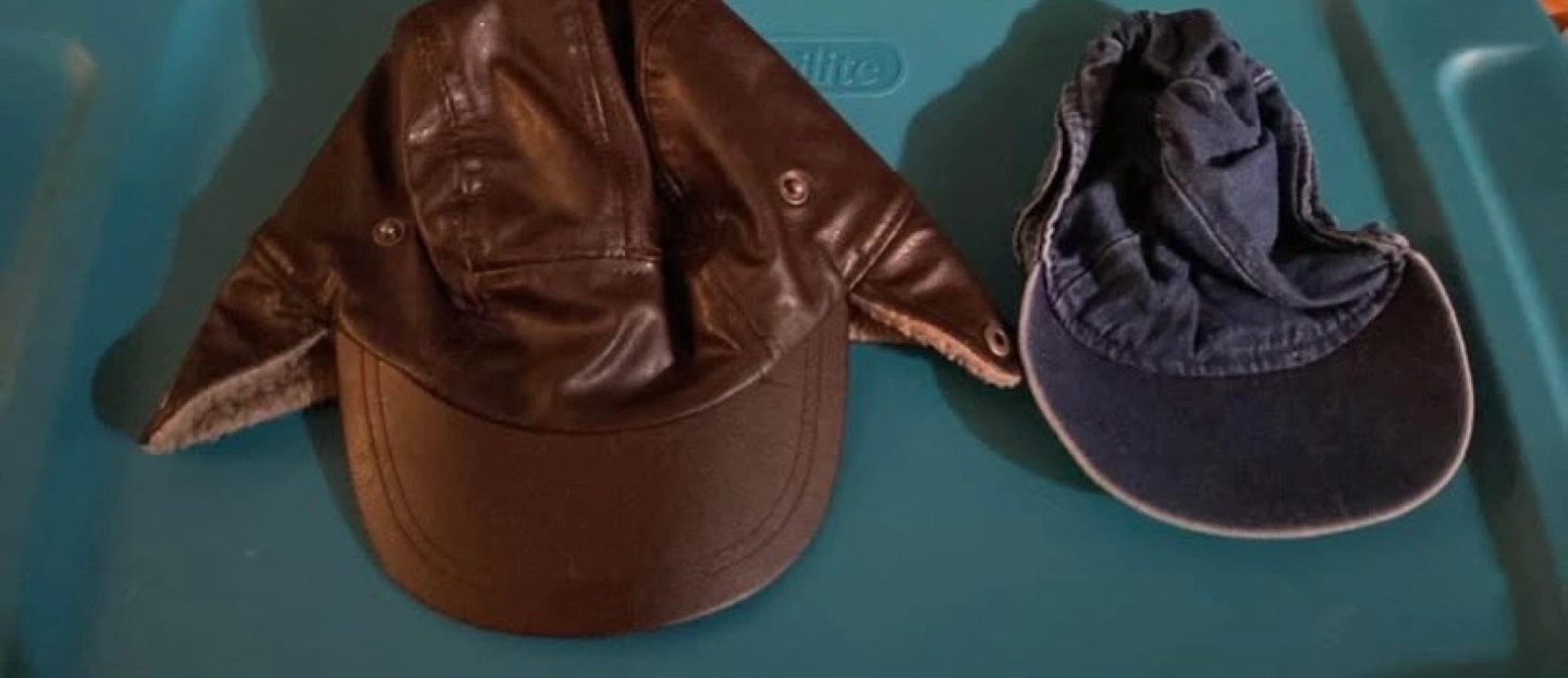 Two hats for sale. Brown faux leather trapper style hat with ear flaps. Denim blue baseball cap. Size 18 months. No delivery. No holds. As is, no refunds. Price is firm.