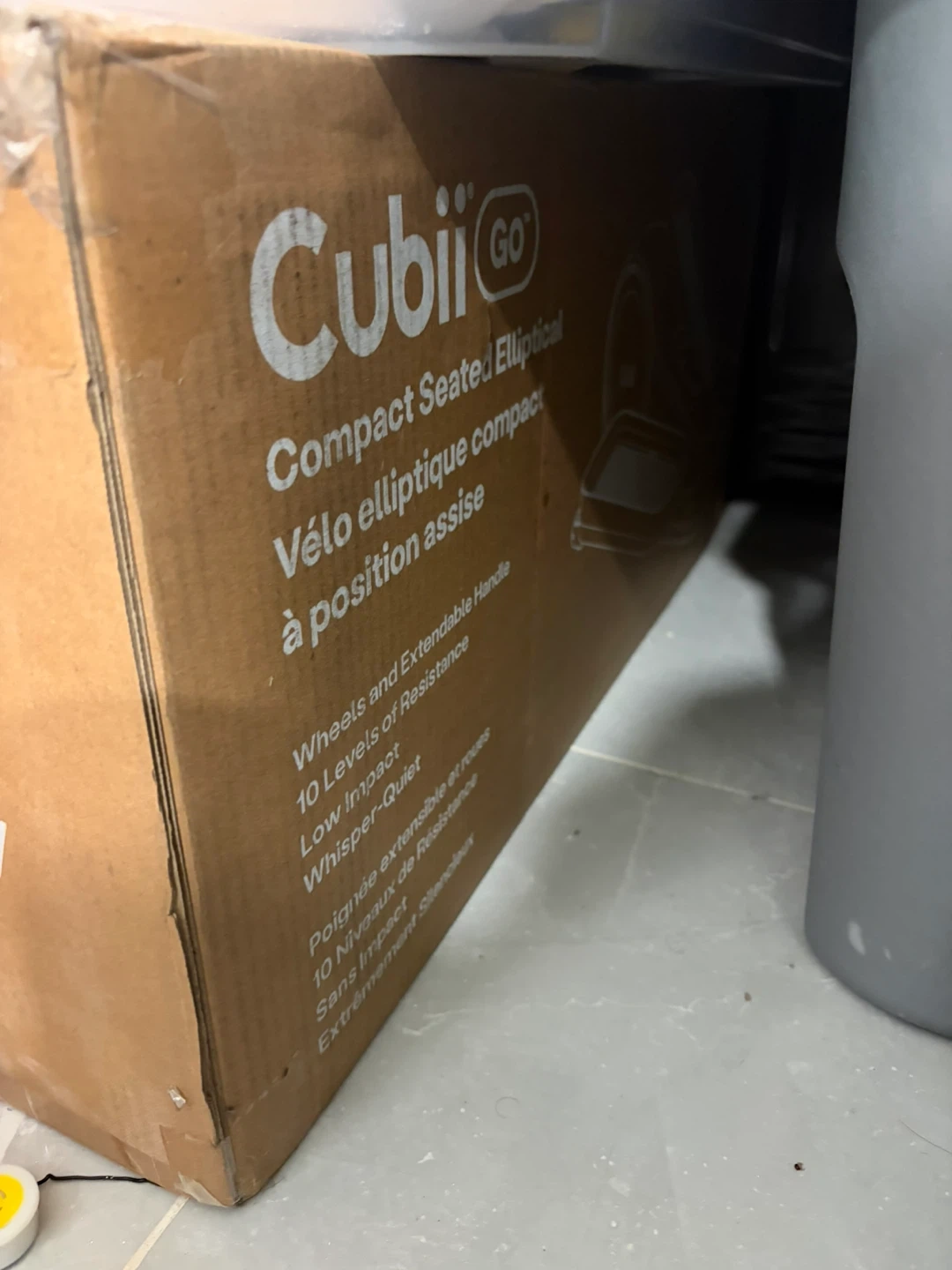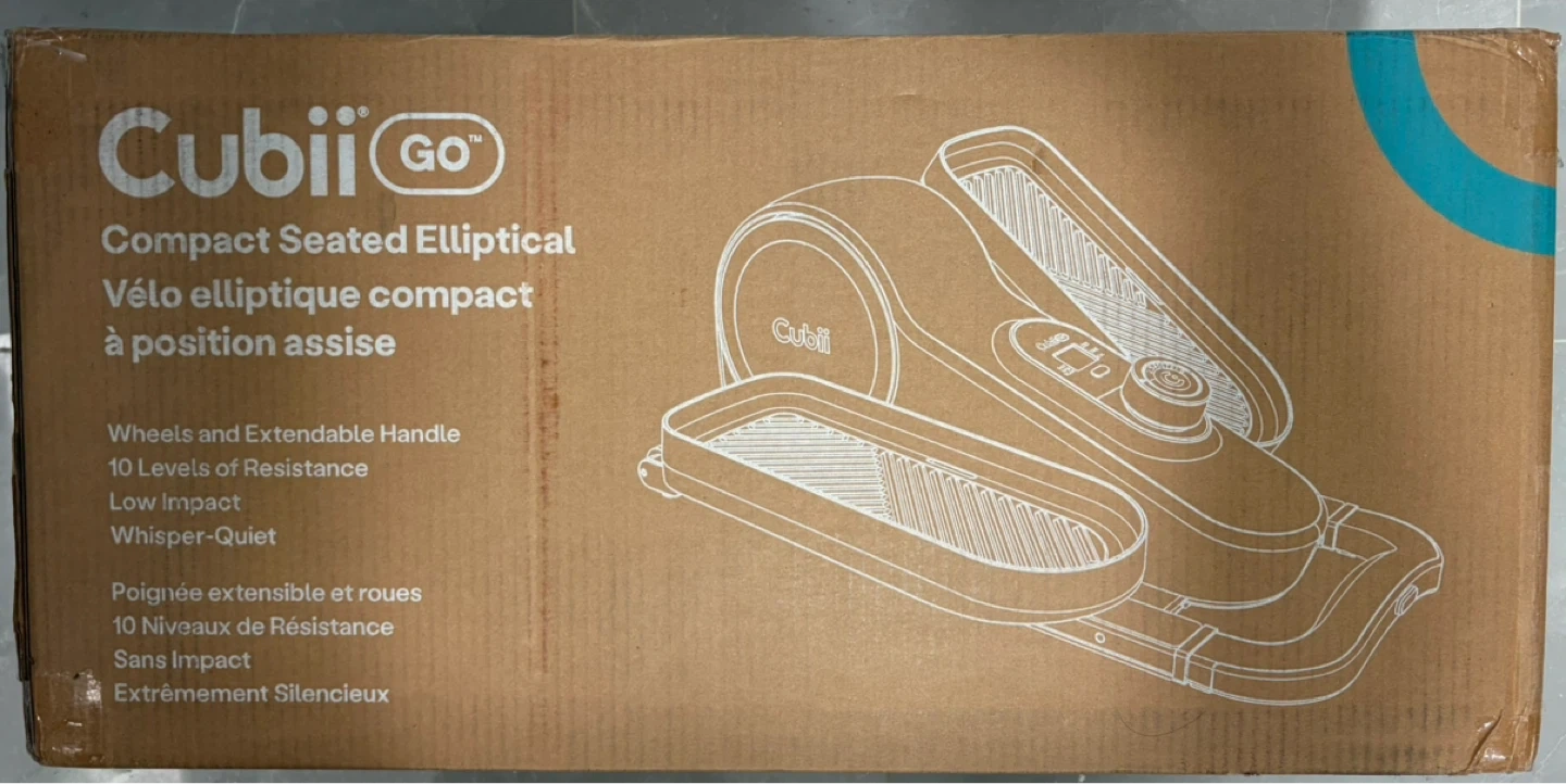 This is a Cubii Go Compact Seated Elliptical. It features wheels and an extendable handle with 10 levels of resistance. It's designed for low impact and whisper-quiet workouts. This is great for seated exercise at home or in the office.