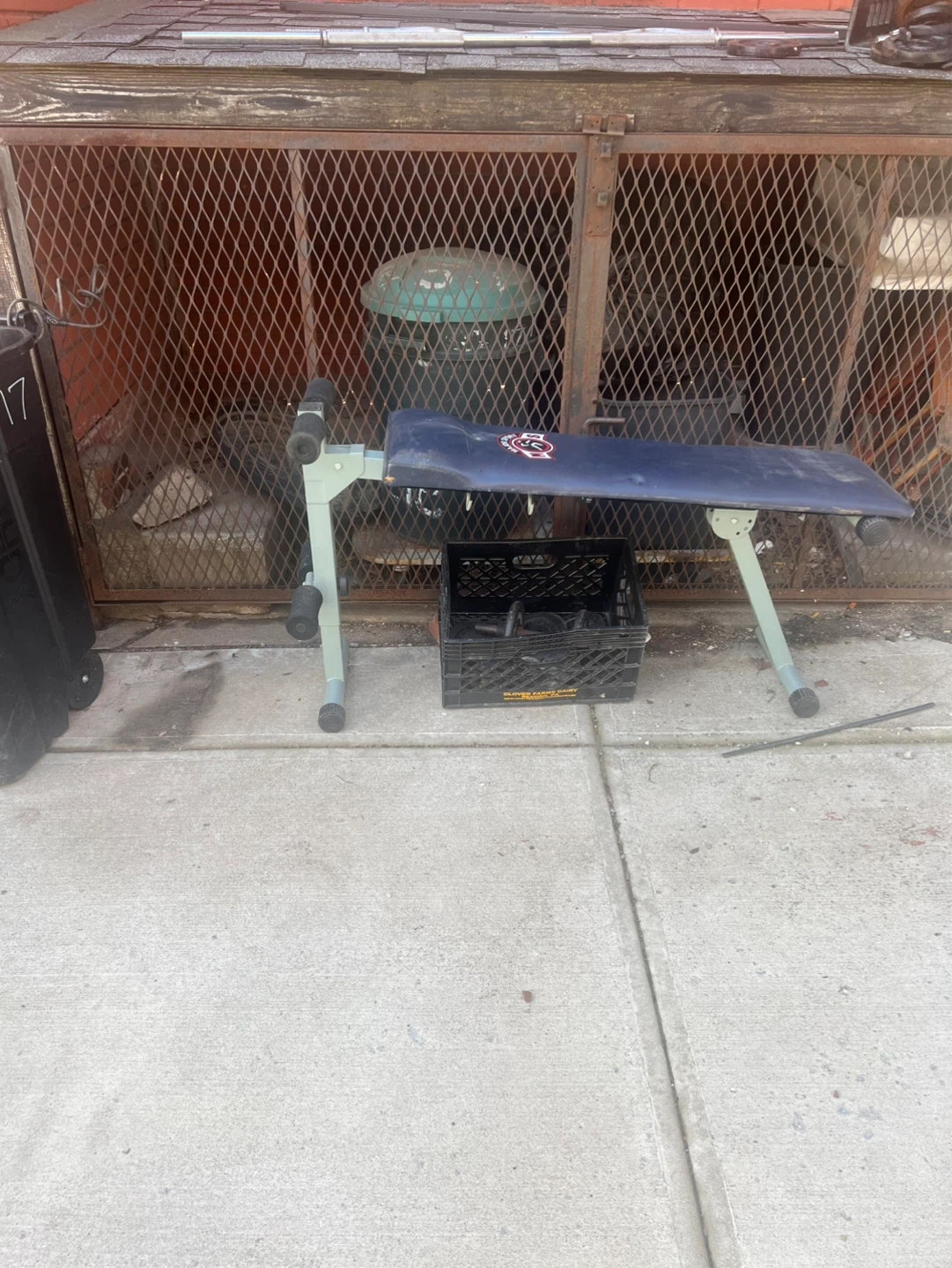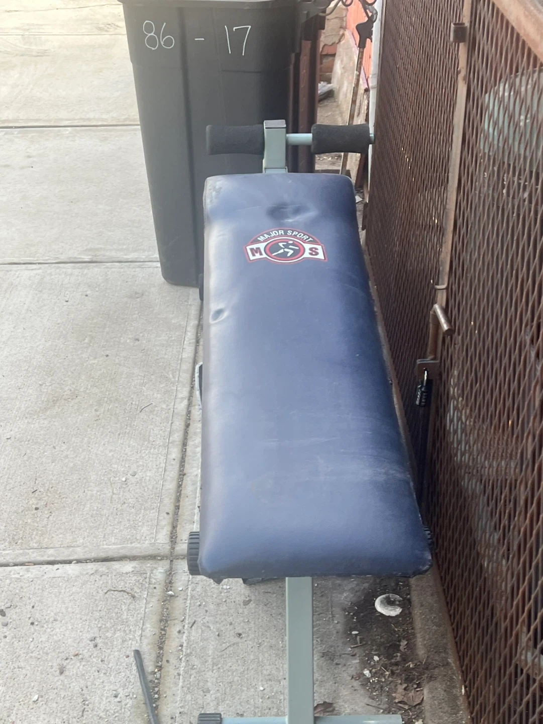 This is a Major Sport weight bench. It's blue with a padded seat and backrest. The frame is silver-toned metal. Great for home workouts!