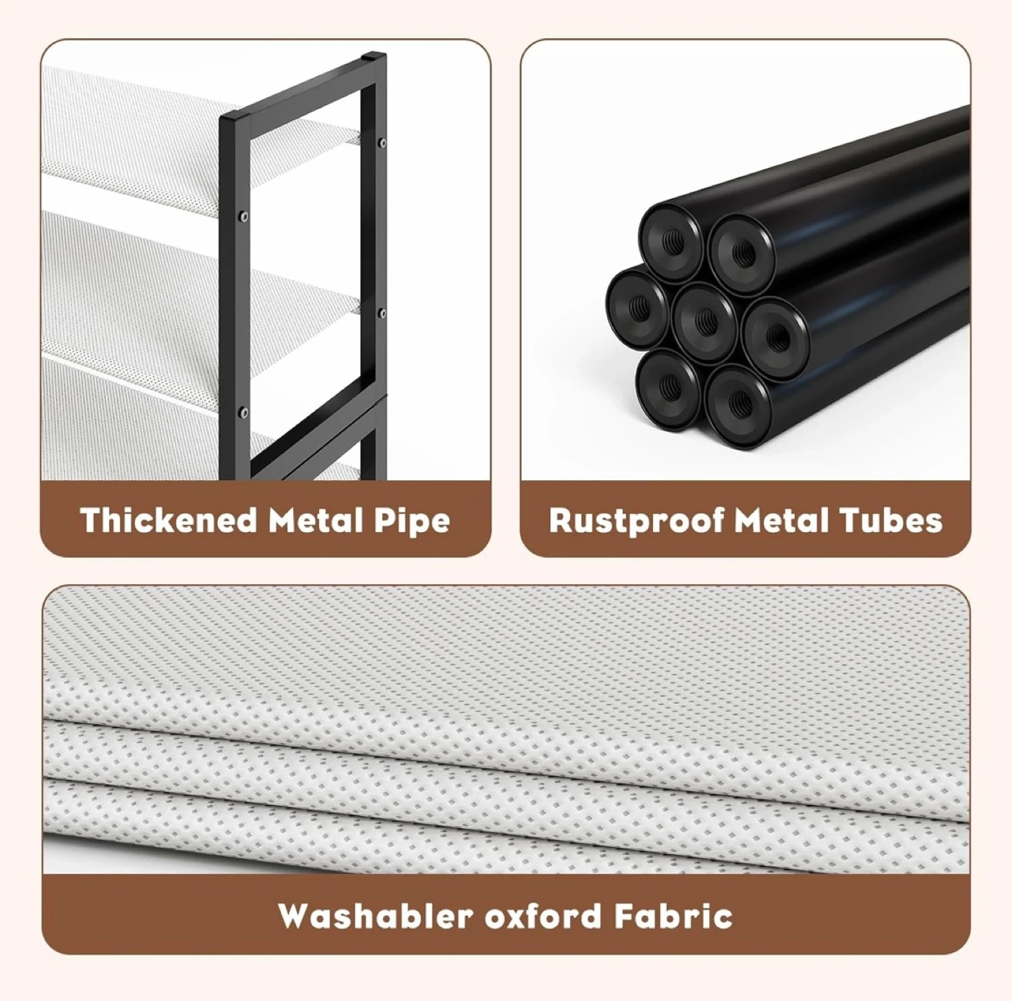 I'm selling a brand new 2-tier shoe rack organizer! It features a sturdy black metal frame and washable oxford fabric shelves. It's perfect for keeping your shoes organized and easily accessible.