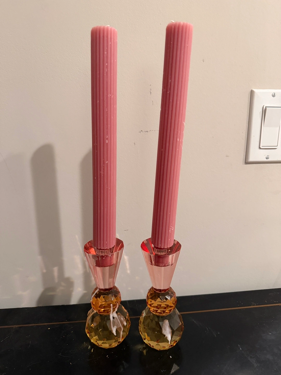 This set includes two elegant candle holders. They feature a cut glass design with a pink-tinted top and amber-toned base. Perfect for adding a touch of sparkle to your table!