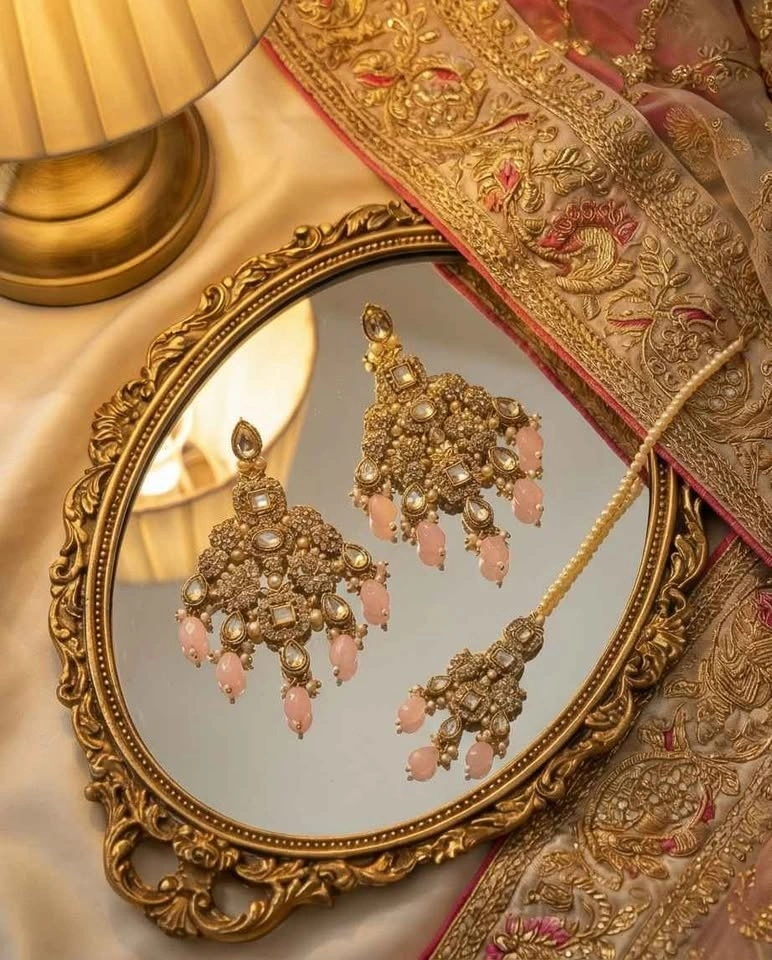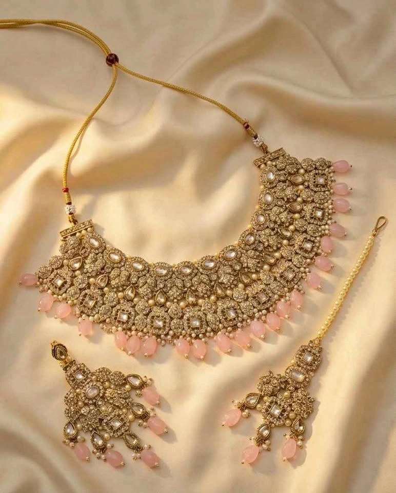 Elegant and luxurious baby pink stone bridal jewelry set. This premium gold-tone set includes a heavy statement necklace, matching earrings, and tikka. Beautifully crafted with detailed stone work and soft baby pink drop stones — perfect for weddings, receptions, Eid, mehndi, or special occasions. Complete 3-piece set. High quality finish. Lightweight yet heavy look. Perfect for brides & festive wear. Close-up photos or video available on request.