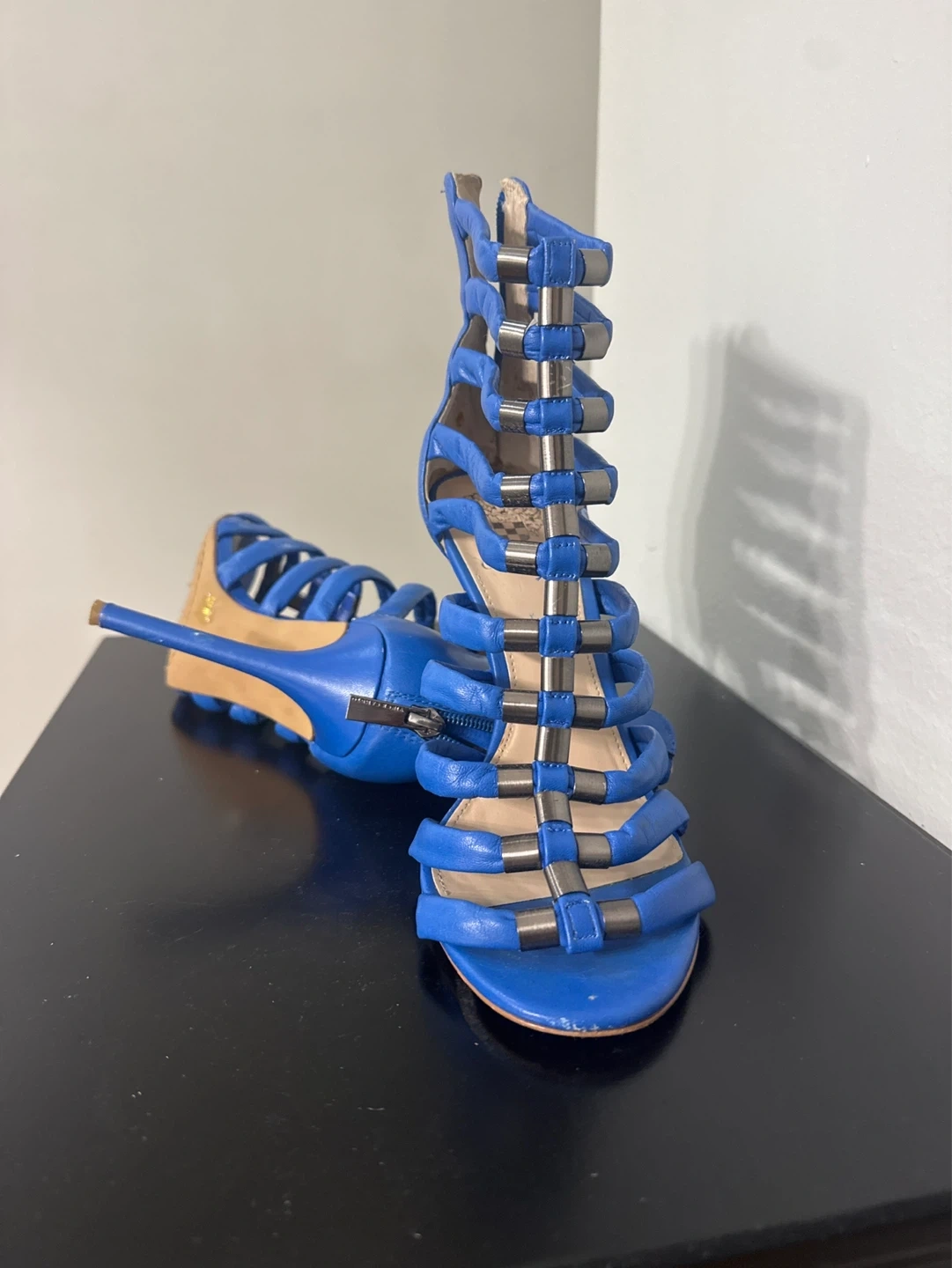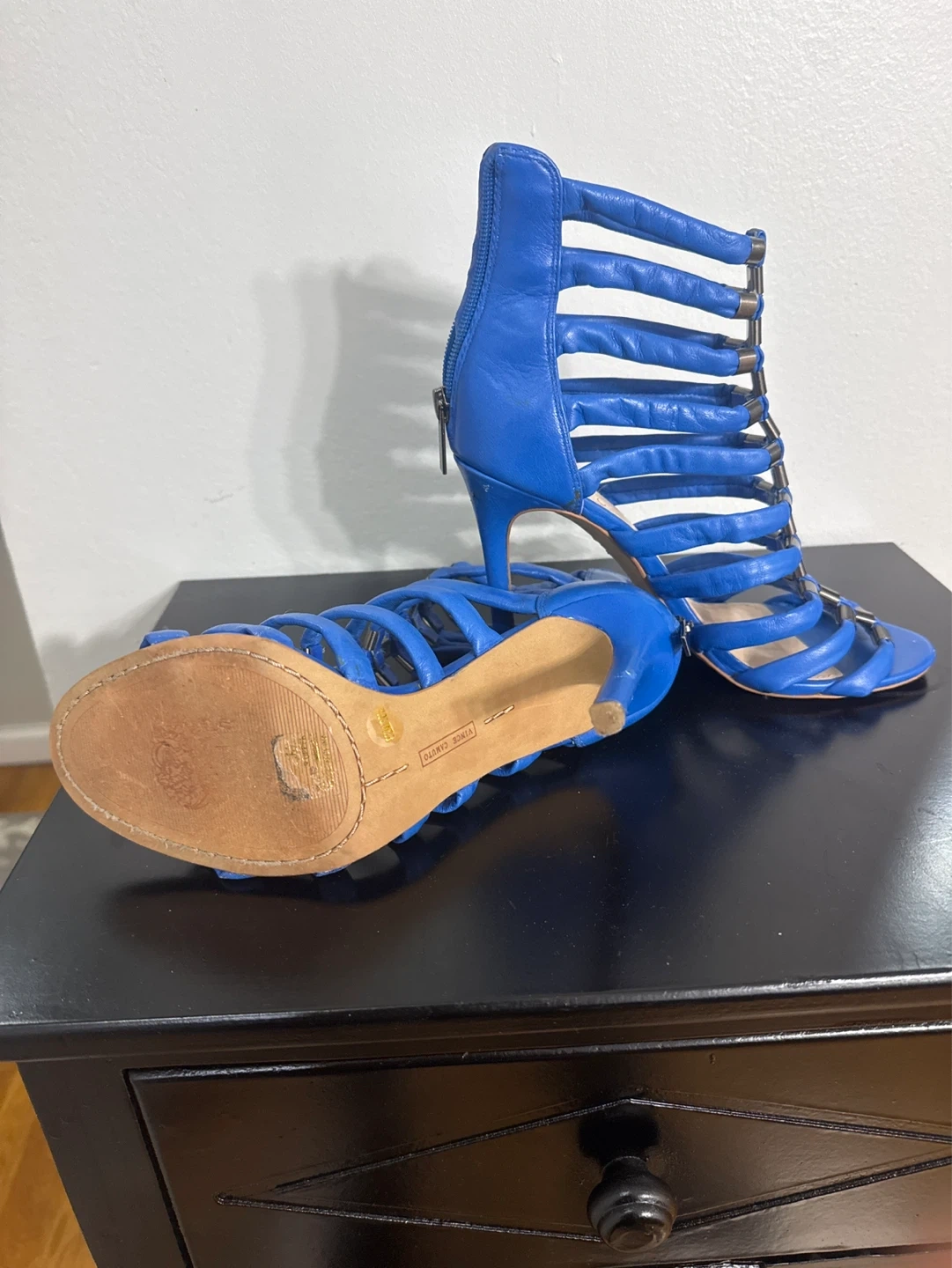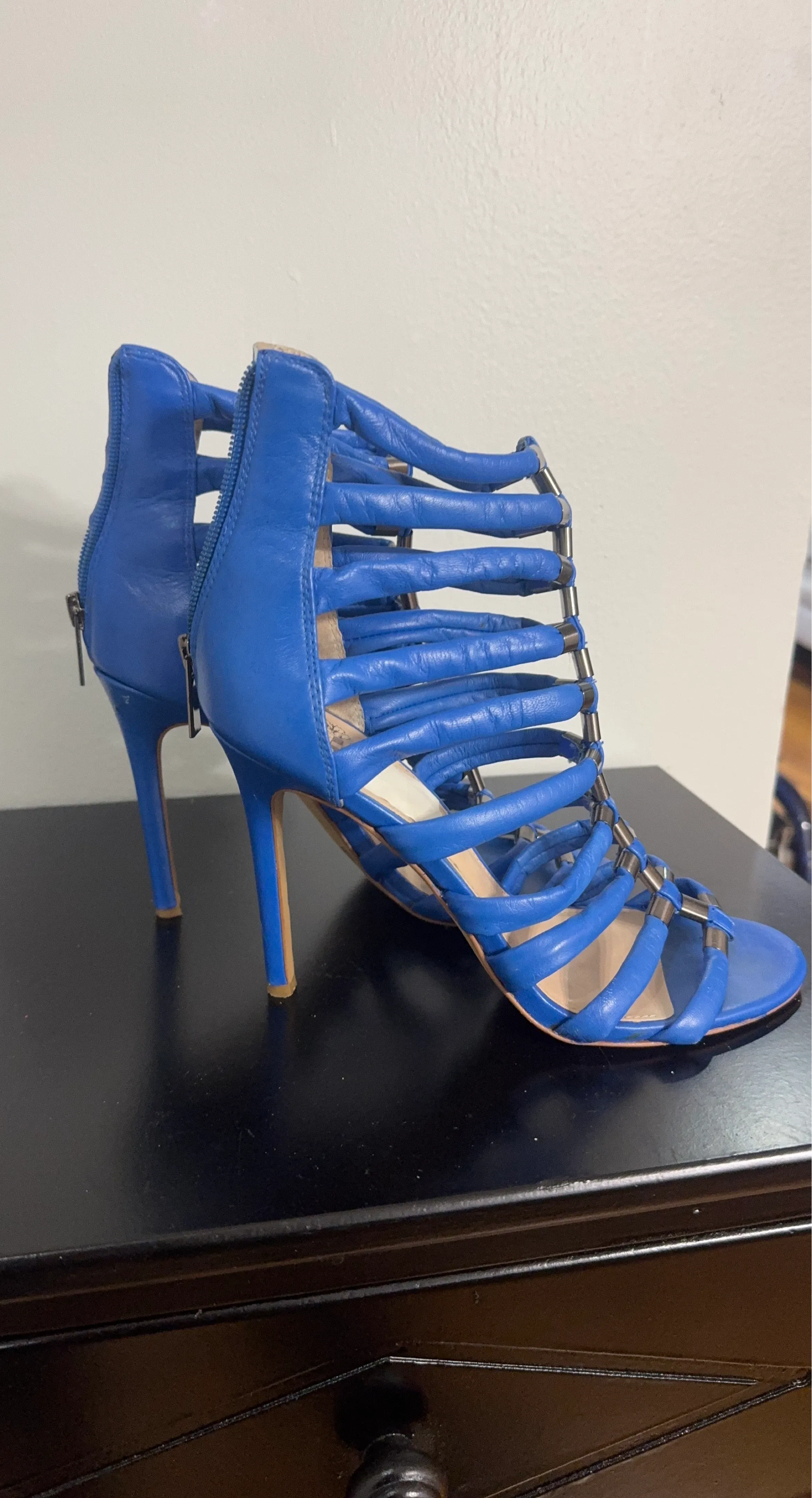 Blue strappy gladiator heels from Vince Camuto. Genuine leather upper with silver-tone hardware. Zip closure at the back.