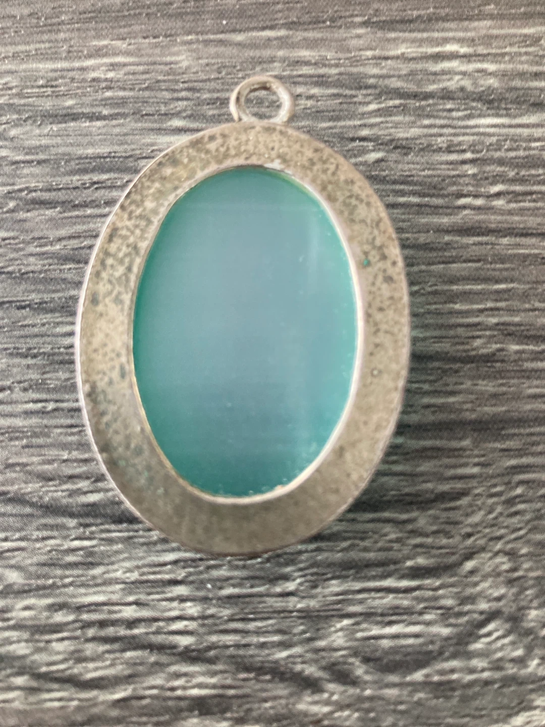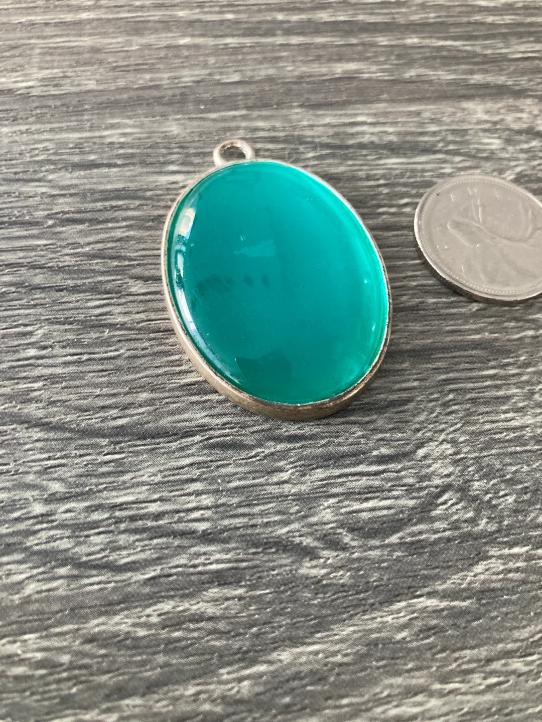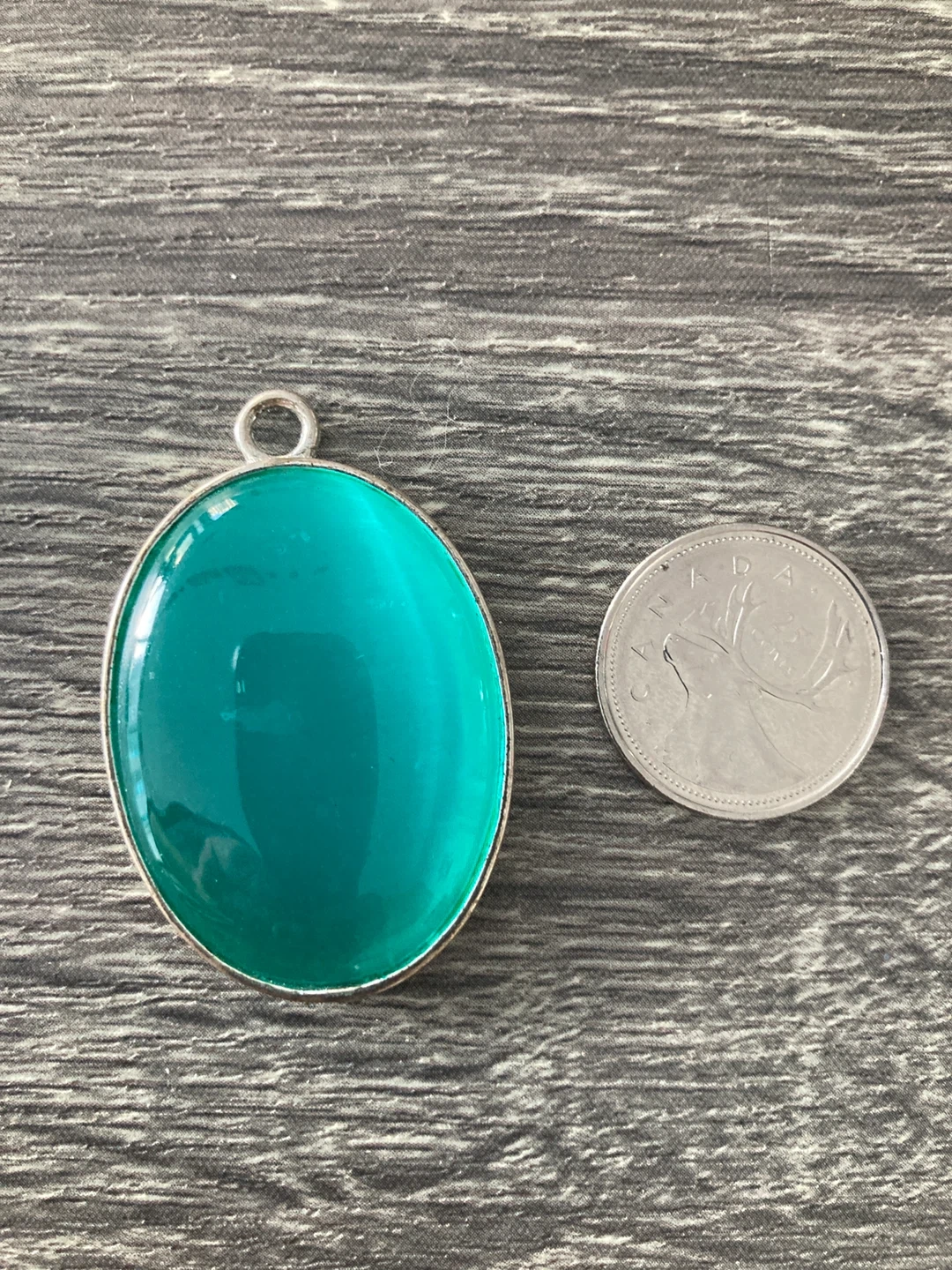 Teal oval pendant with a silver-tone setting. This pendant is about the size of a Canadian quarter. It's a lovely shade of teal!