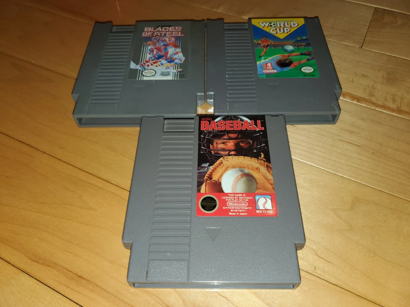 We are selling a couple of Nintendo NES game cartridges including Super Sprint, World Cup, Blades of Steel, Xexyz, Fishing Derby, and Tecmo Baseball.