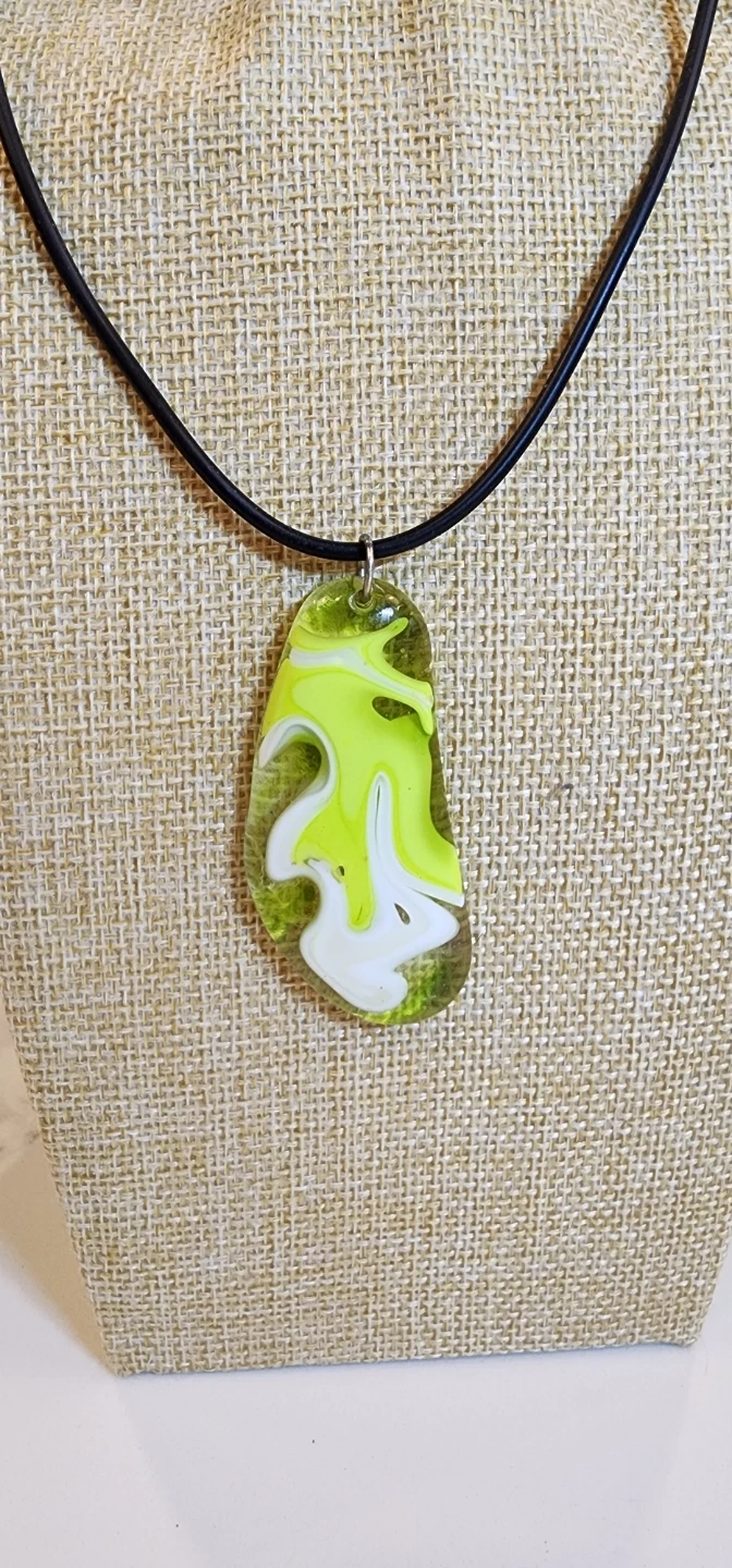 Unique pendant necklace with a green and white design. The pendant has a smooth, polished finish and hangs from a black cord. Perfect for adding a pop of colour to any outfit!