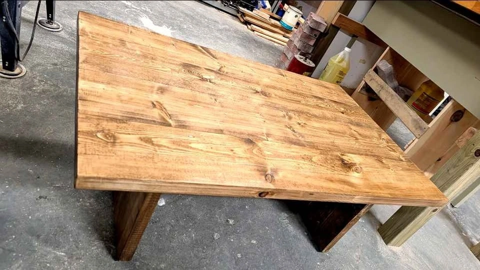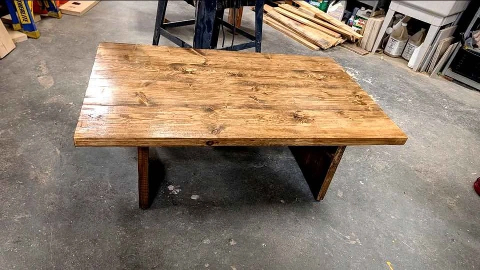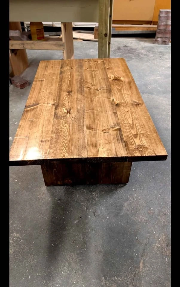Beautiful handmade coffee table, crafted with care using selected spruce wood. Solid and sturdy, built to last. The natural wood grain and knots give it a warm rustic farmhouse look that fits perfectly in modern or cozy spaces. The table has been carefully sanded and finished 4 times with a water-based wood finish, making the surface smooth, durable, and easy to maintain. Finished in a classic Early American stain.