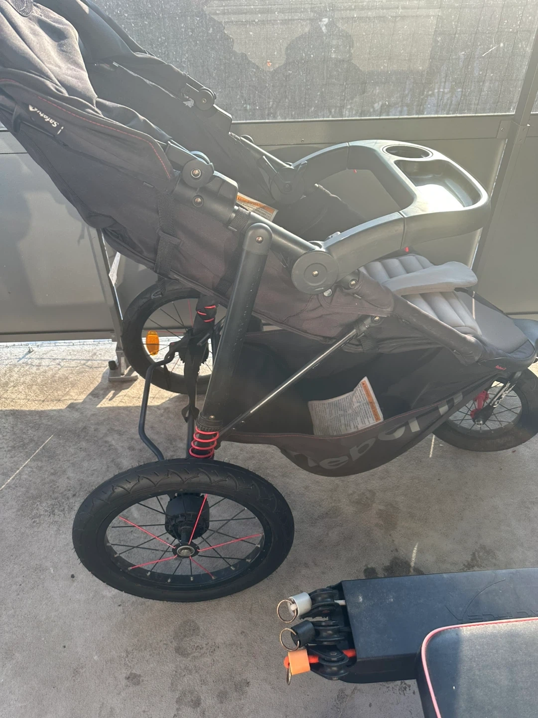 This is a single stroller for jogging. It's black with grey padding and has large wheels for easy maneuverability. It includes a tray with a cup holder.