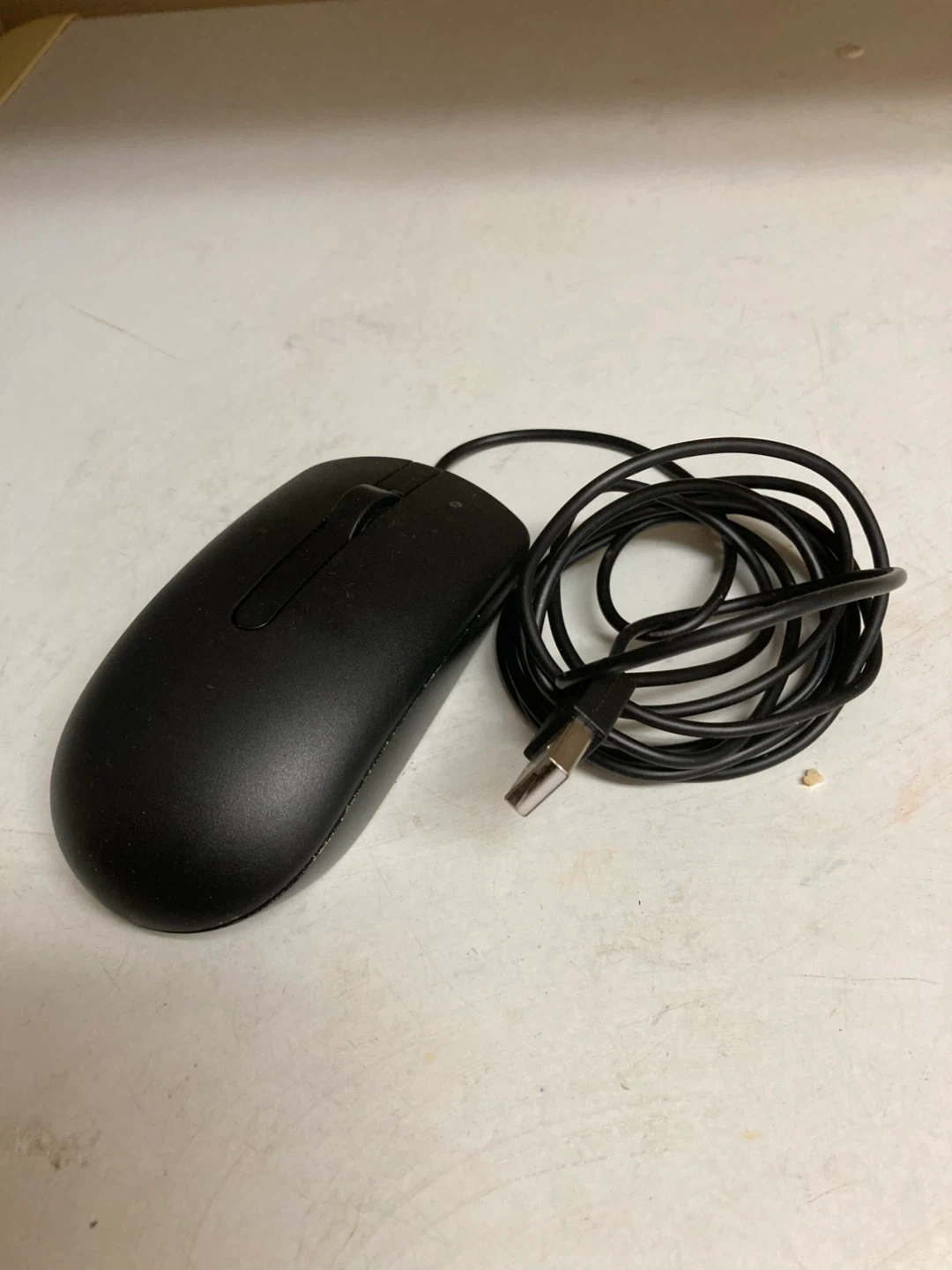 It's a black wired USB mouse. It has a standard scroll wheel and two buttons. This mouse connects via USB.