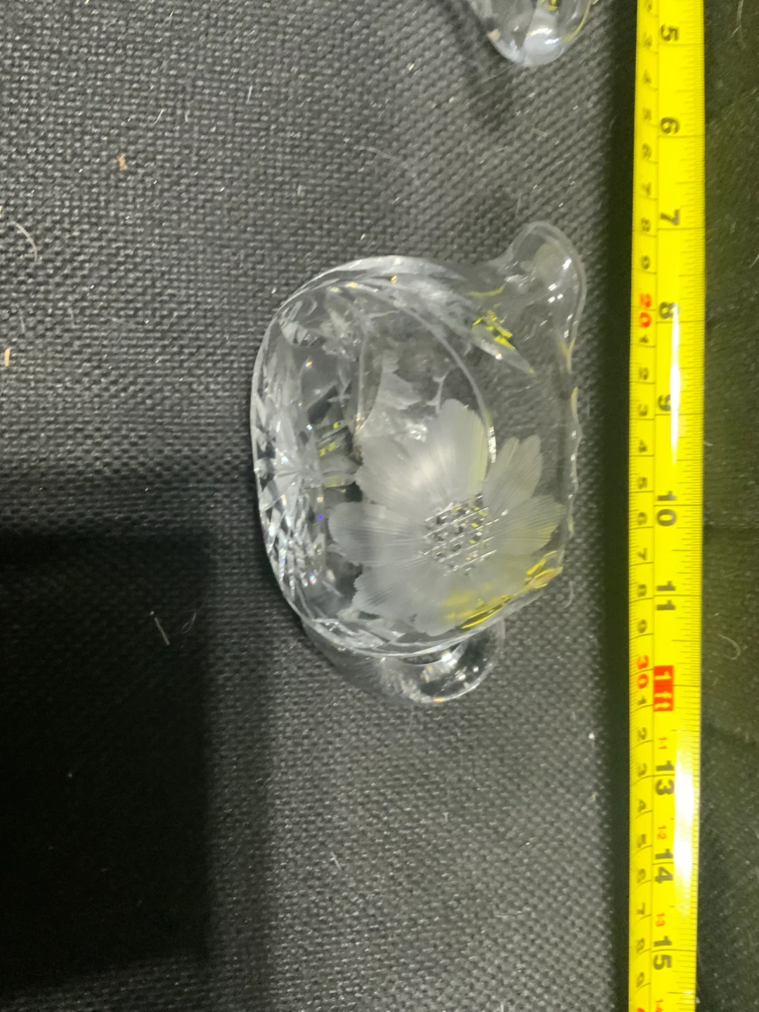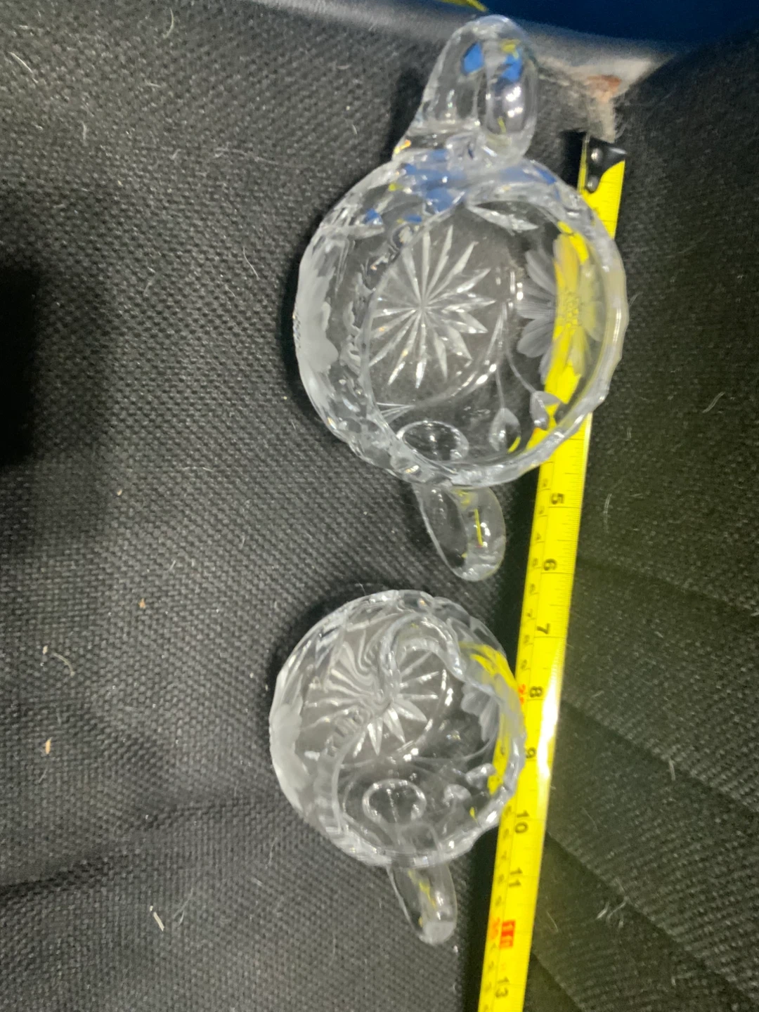 A lovely set featuring a clear crystal glass sugar bowl and a matching creamer. Both pieces are etched with delicate floral designs, adding a touch of elegance to your table. Perfect for serving sugar and cream at your next tea party!