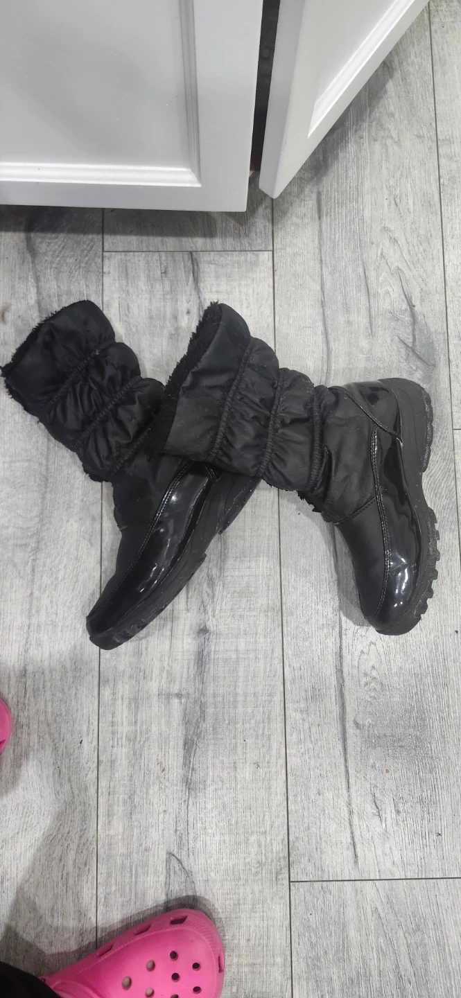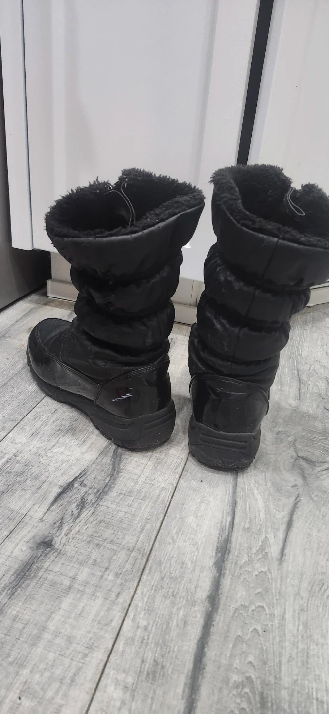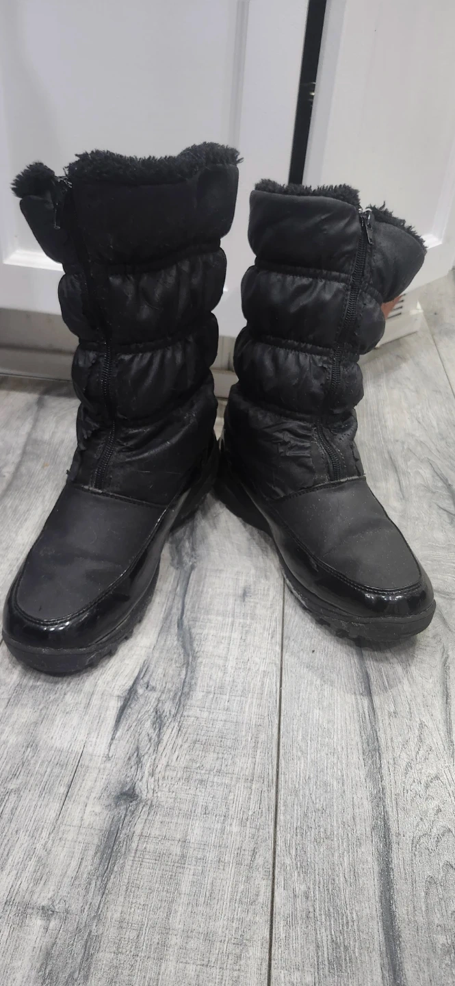 Cozy black puffer winter boots with faux fur lining. They're water-resistant and have a side zipper for easy on and off. The bottom is a durable sole, perfect for snowy days!