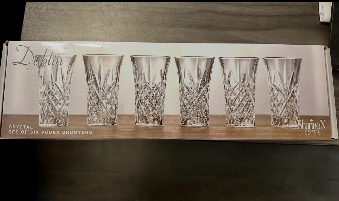 Set of six Dublin crystal vodka shooters, brand new. These glasses are beautifully crafted with intricate diamond patterns. Perfect for serving shots!