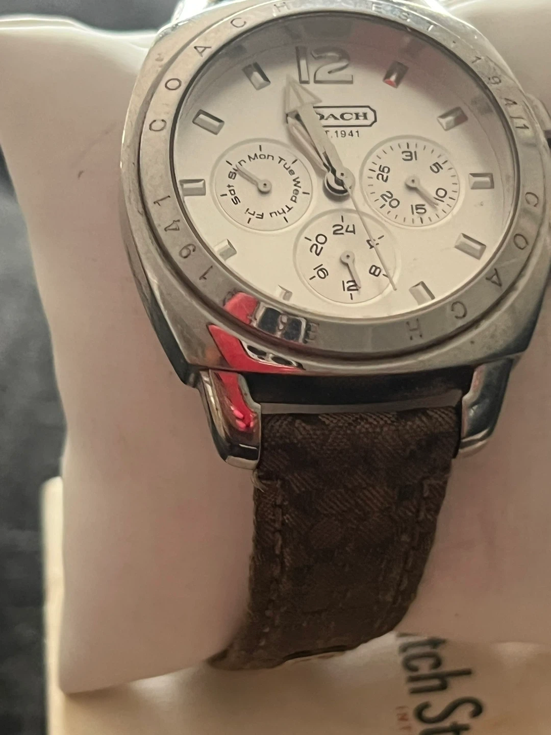 Selling a Coach watch in good condition! It has a silver face and a brown patterned band. It features three subdials for day, date, and seconds. A stylish timepiece to add to your collection!