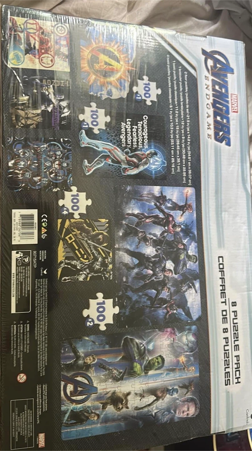 This pack includes 8 puzzles featuring characters from Marvel's Avengers Endgame. Each puzzle is 100 pieces. Dimensions are 12" x 14.75" (30.48 cm x 37.46 cm).