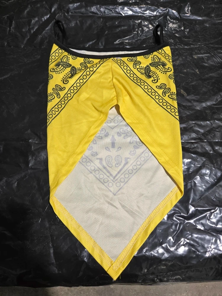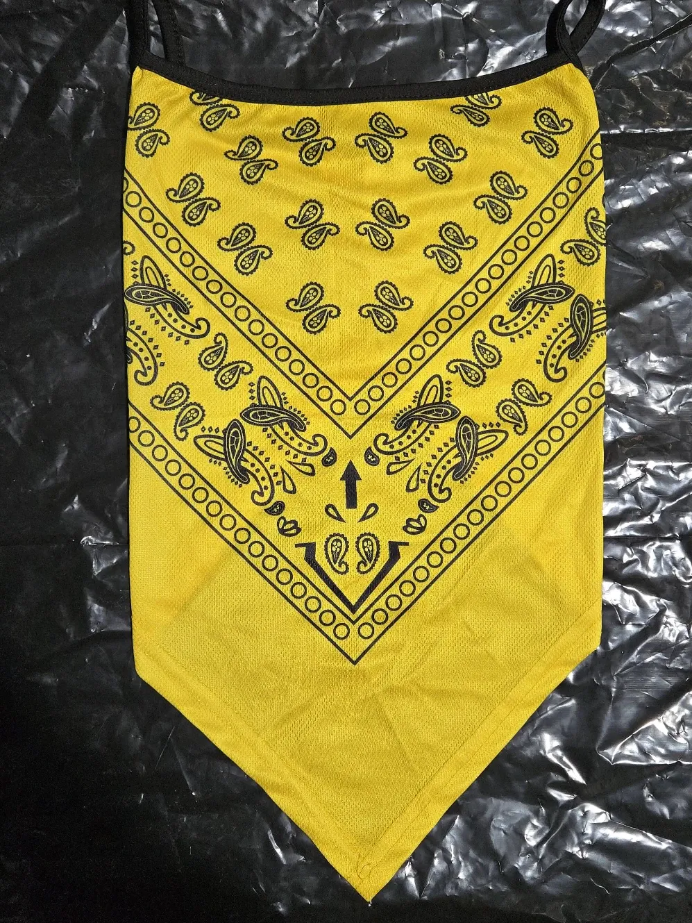 This yellow face mask features a classic black paisley bandana print. It has ear loops for a secure fit. The material appears to be a breathable fabric.