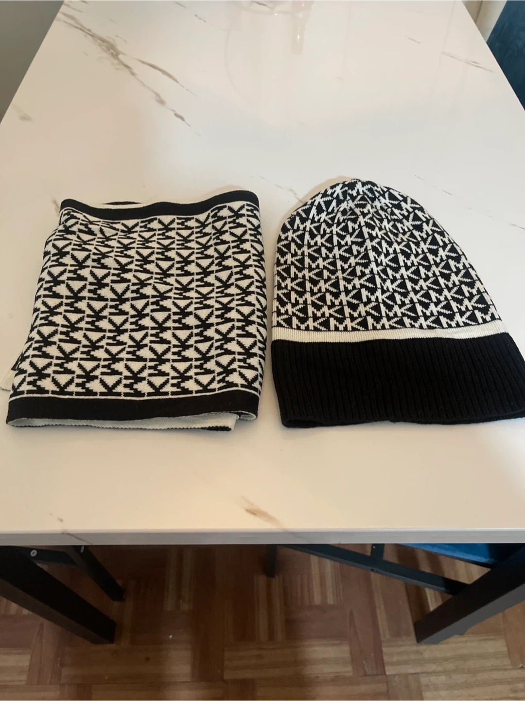 Selling a Michael Kors beanie and scarf set. The set is black and white and features the MK logo pattern. It's in great condition!