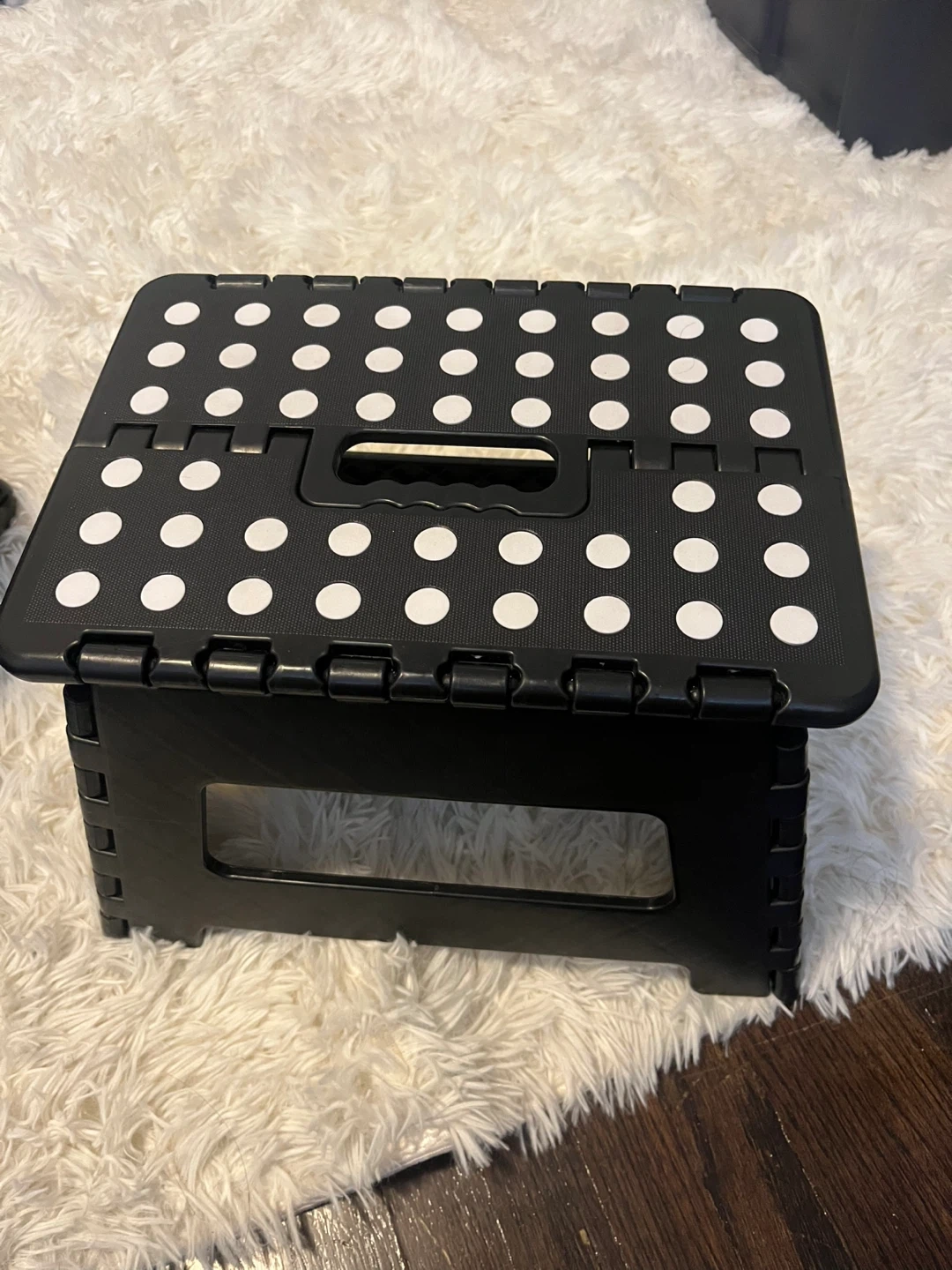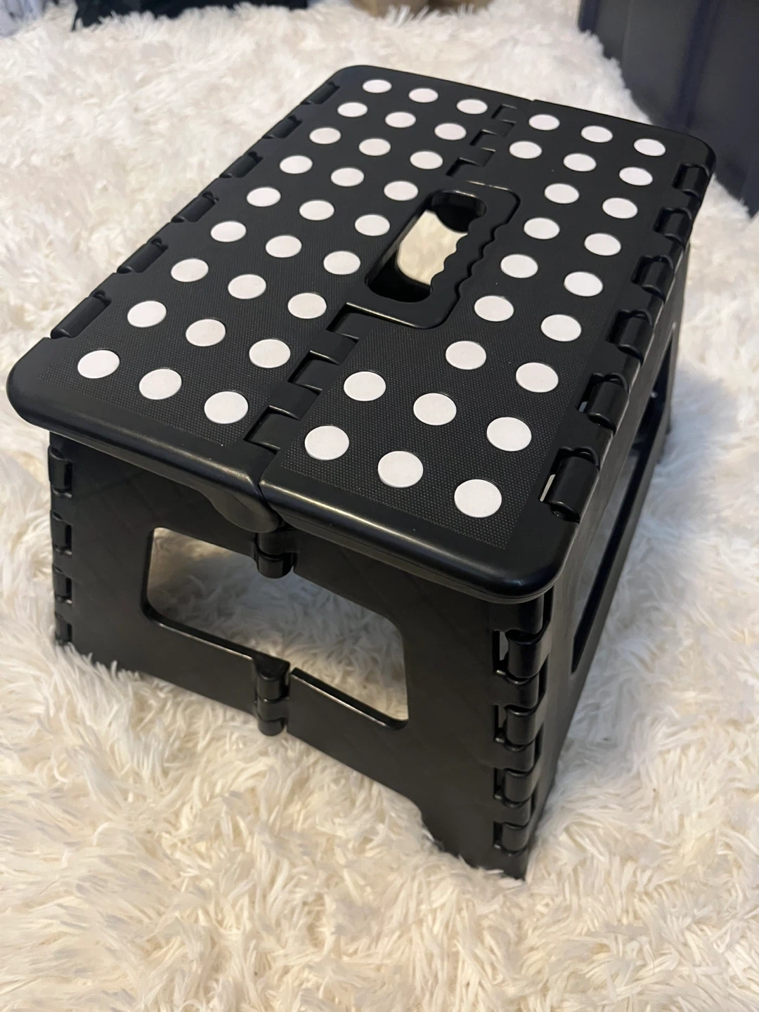 Selling a handy folding step stool in black with white polka dots! It's lightweight and easy to carry around the house. Perfect for reaching those high shelves in the kitchen or garage. Folds flat for easy storage too!