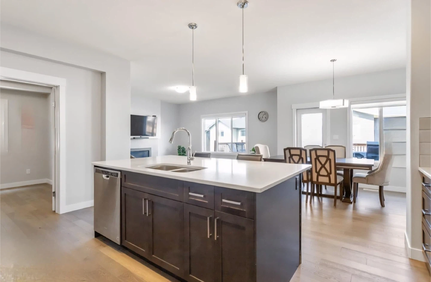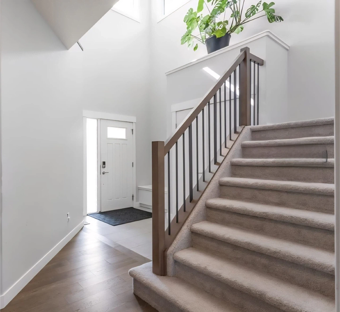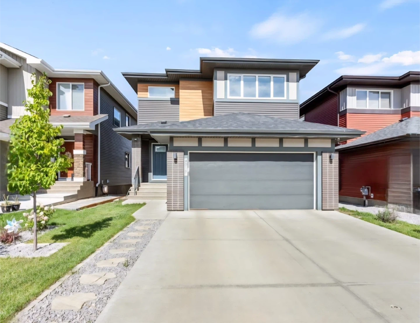 The exterior boasts a striking color palette and a sealed exposed aggregate walkway. Step inside to a grand foyer with 17-foot ceilings, leading to an open-concept living area with a fireplace and a gourmet kitchen featuring quartz countertops and five stainless steel appliances. The main floor is enhanced with upgraded engineered hardwood flooring, a versatile den, and a spacious mudroom with ample storage.