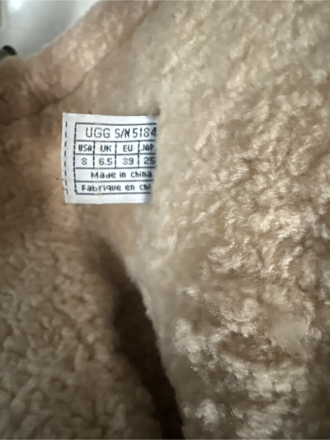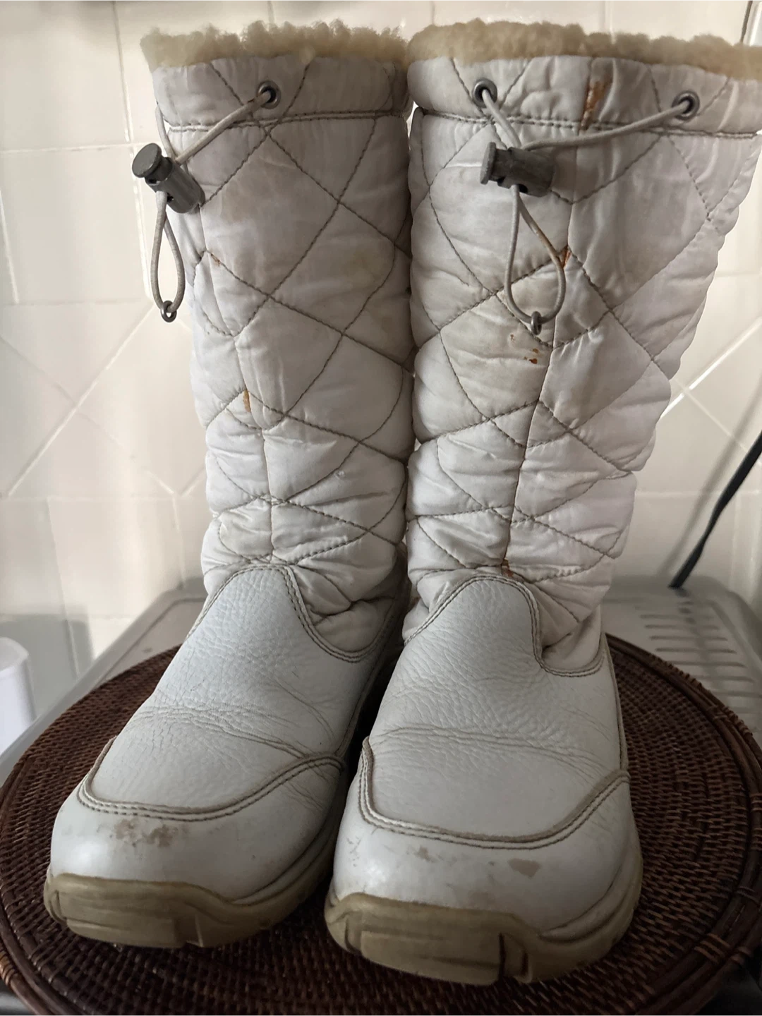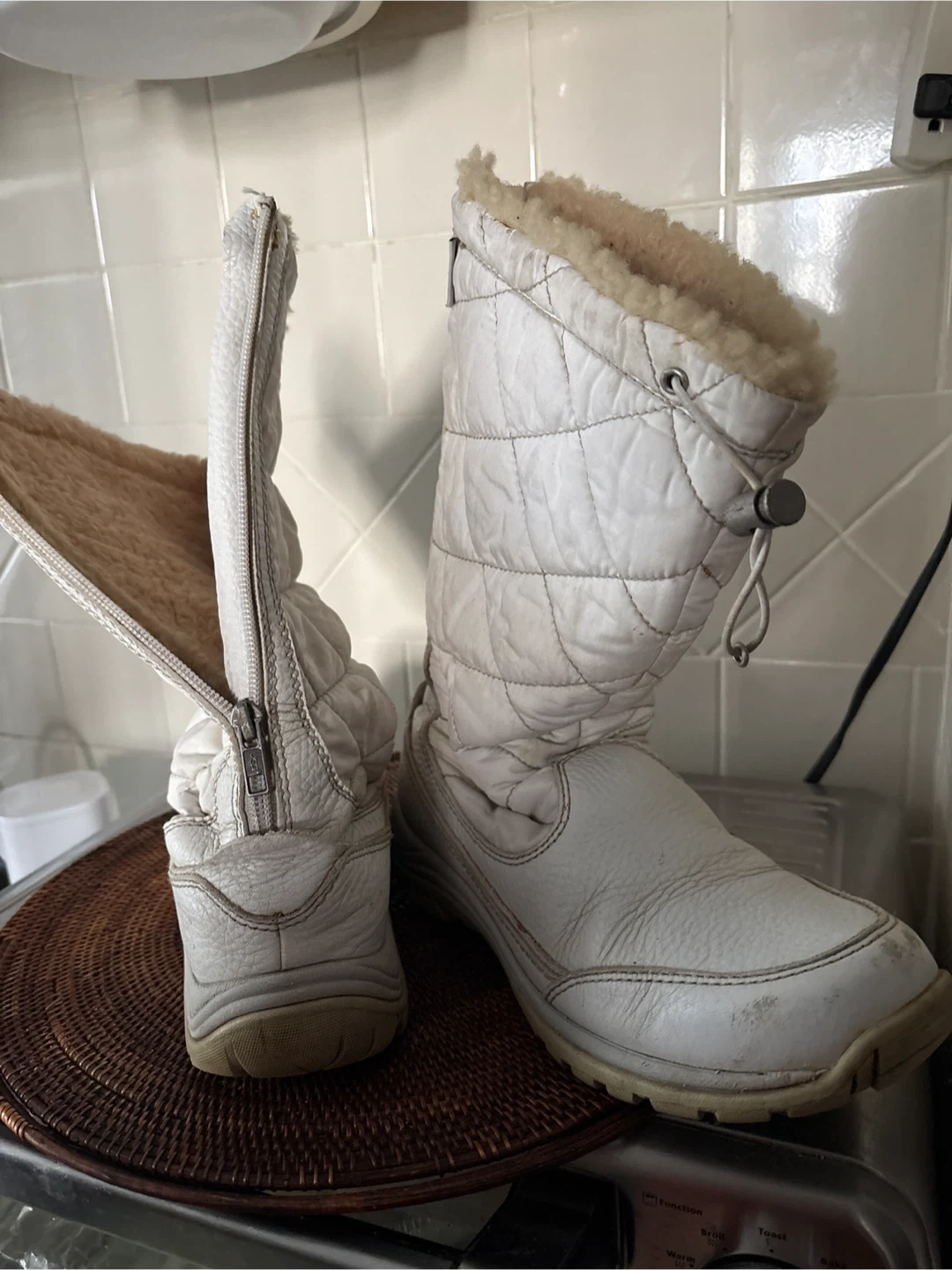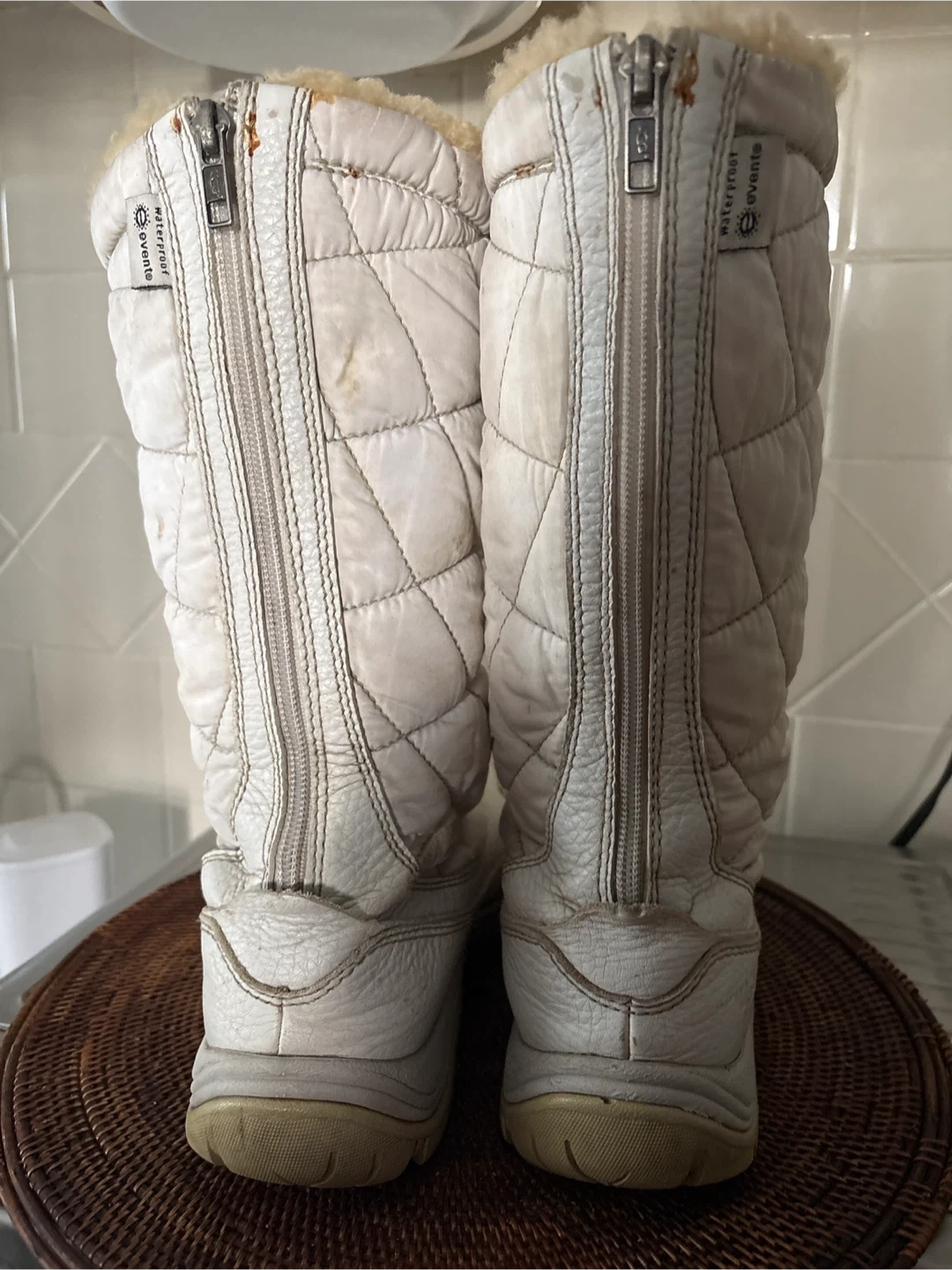 These UGG boots are white with a quilted shaft and a leather foot. They feature full-length zippers up the back and a cozy shearling lining. Waterproof eVent technology.