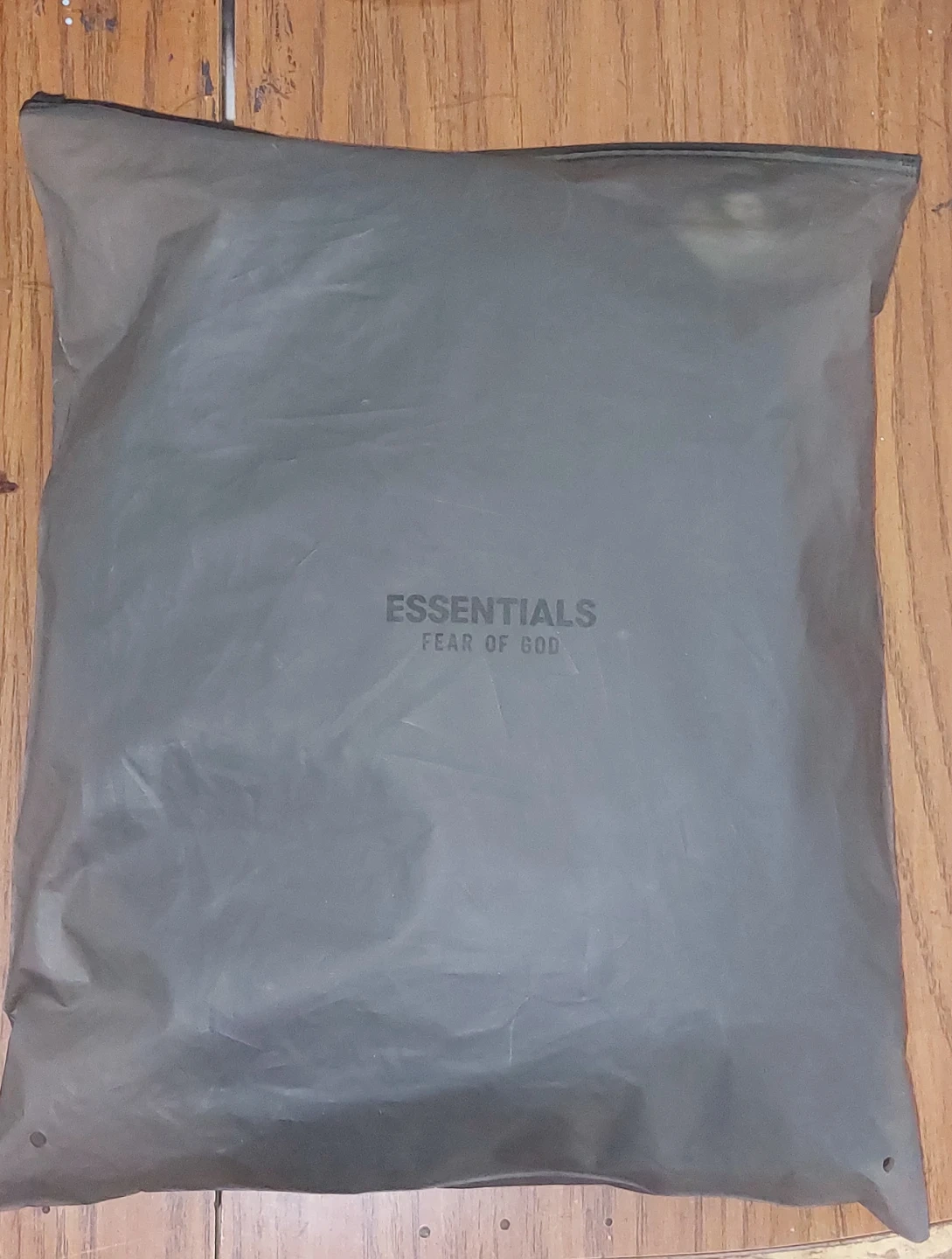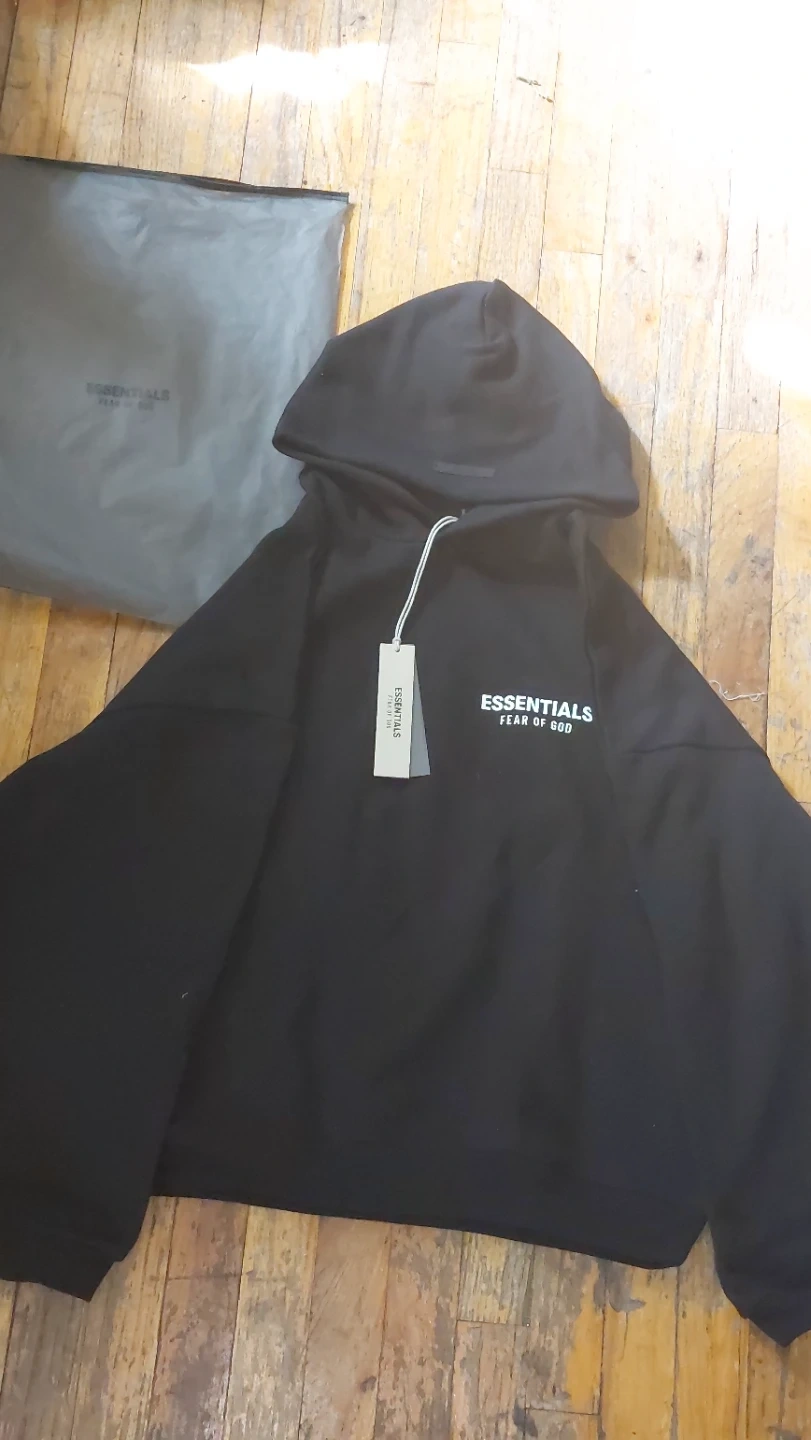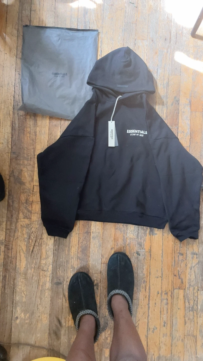 This is a black Fear of God Essentials hoodie. It comes with the original dust bag. This hoodie is made for comfort and style.