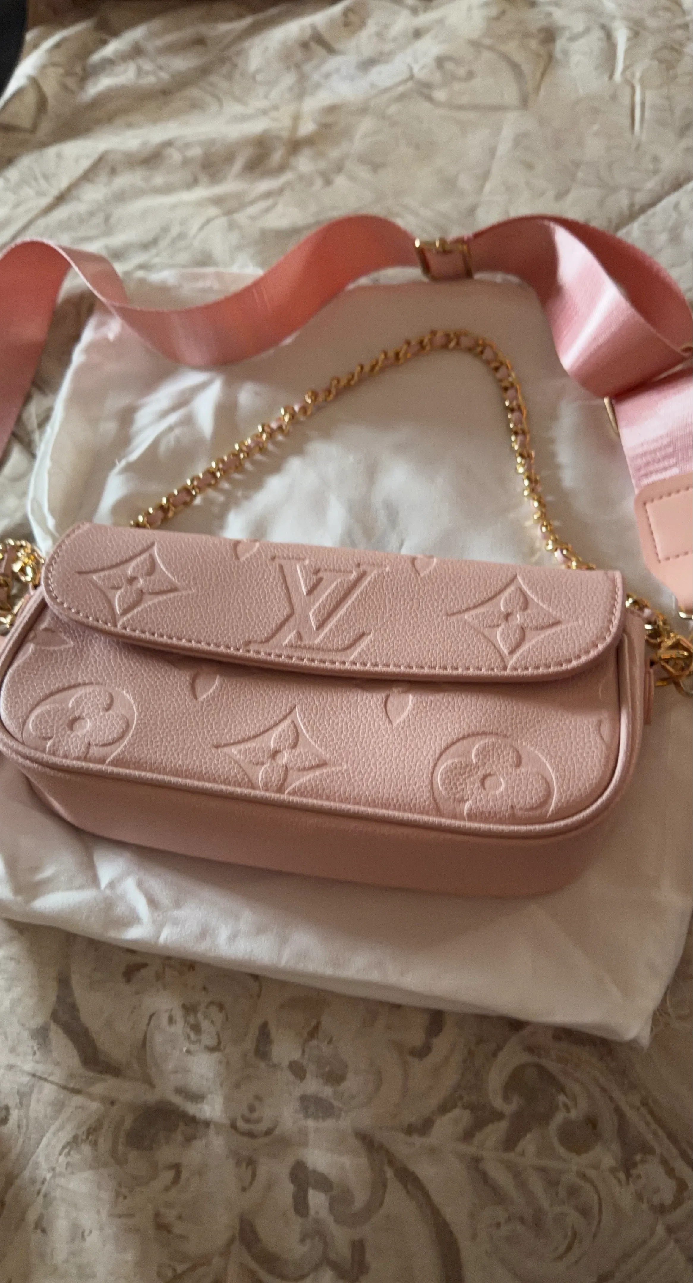 This Louis Vuitton shoulder bag comes in a soft pink hue with embossed monogram detailing. It features a gold chain strap and a complementary adjustable pink fabric strap. The bag's construction appears to be leather.