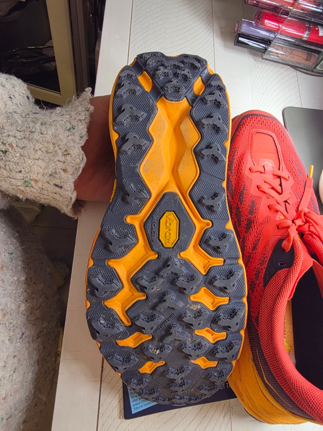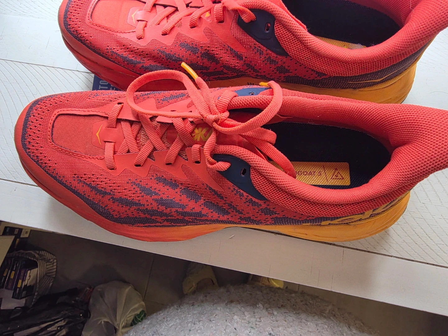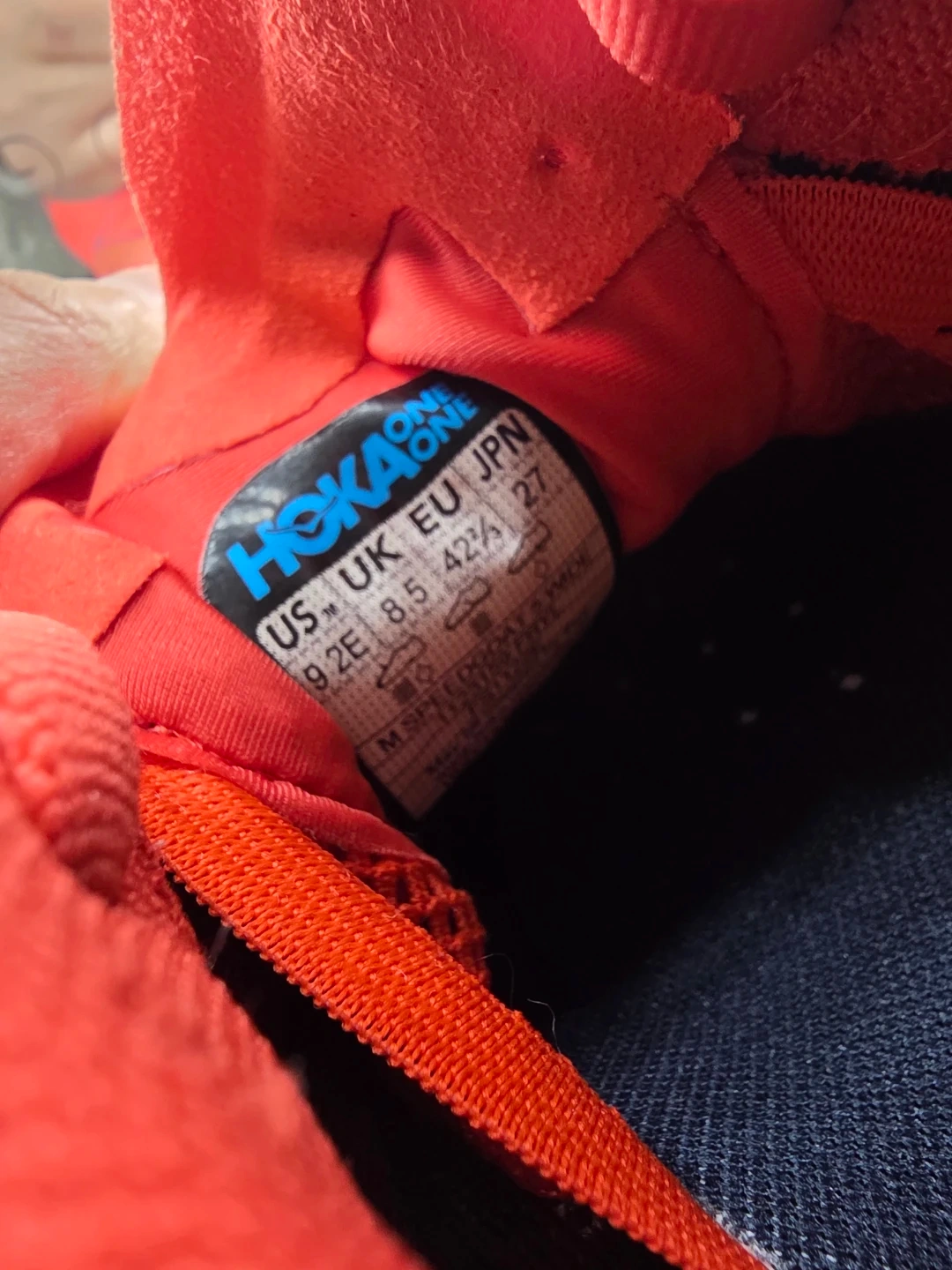 Hoka One One trail running shoes in red and orange. Vibram outsole for grip. Size 9.5 2E US Men's. I acquired these shoes while traveling, as I had forgotten my athletic footwear. I typically wear a women's size 10, and these are a men's size 9. They have been worn minimally and are in excellent condition. My reason for selling them is due to plantar fasciitis; they exacerbate my condition during running rather than providing relief.