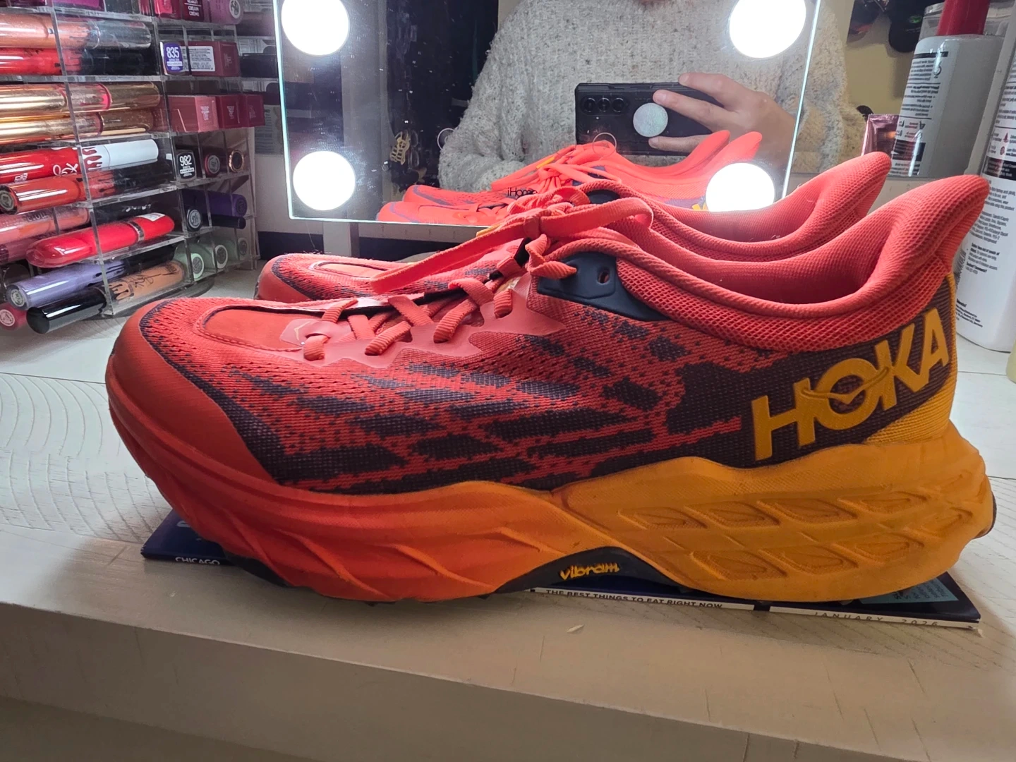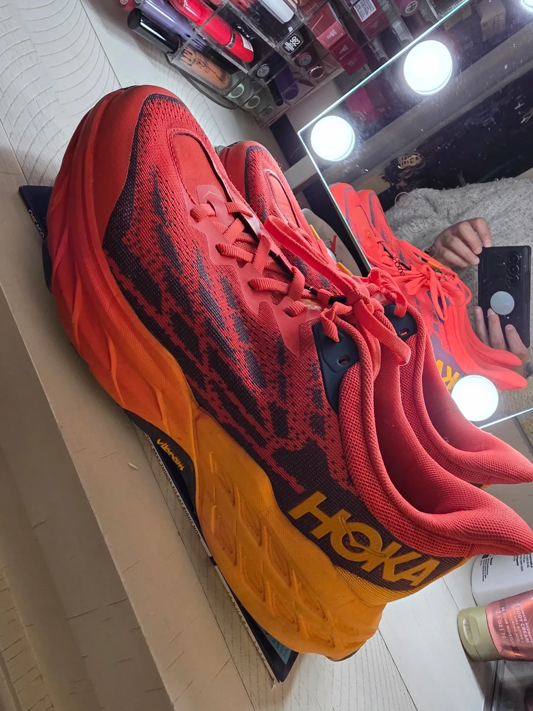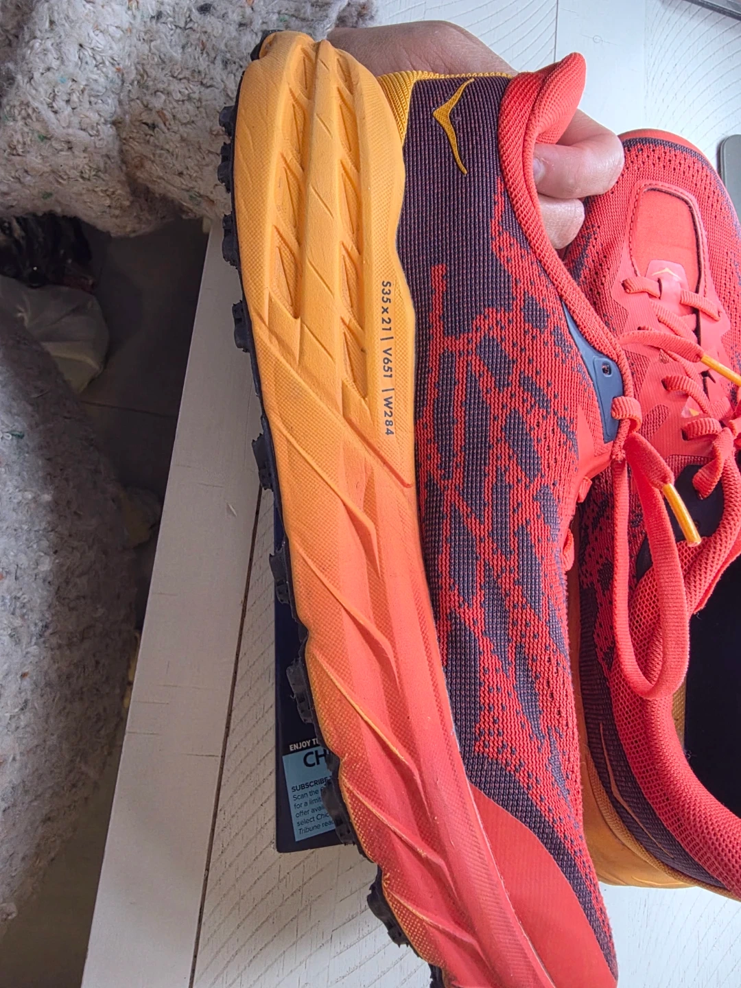 Hoka One One trail running shoes in red and orange. Vibram outsole for grip. Size 9.5 2E US Men's. I acquired these shoes while traveling, as I had forgotten my athletic footwear. I typically wear a women's size 10, and these are a men's size 9. They have been worn minimally and are in excellent condition. My reason for selling them is due to plantar fasciitis; they exacerbate my condition during running rather than providing relief.