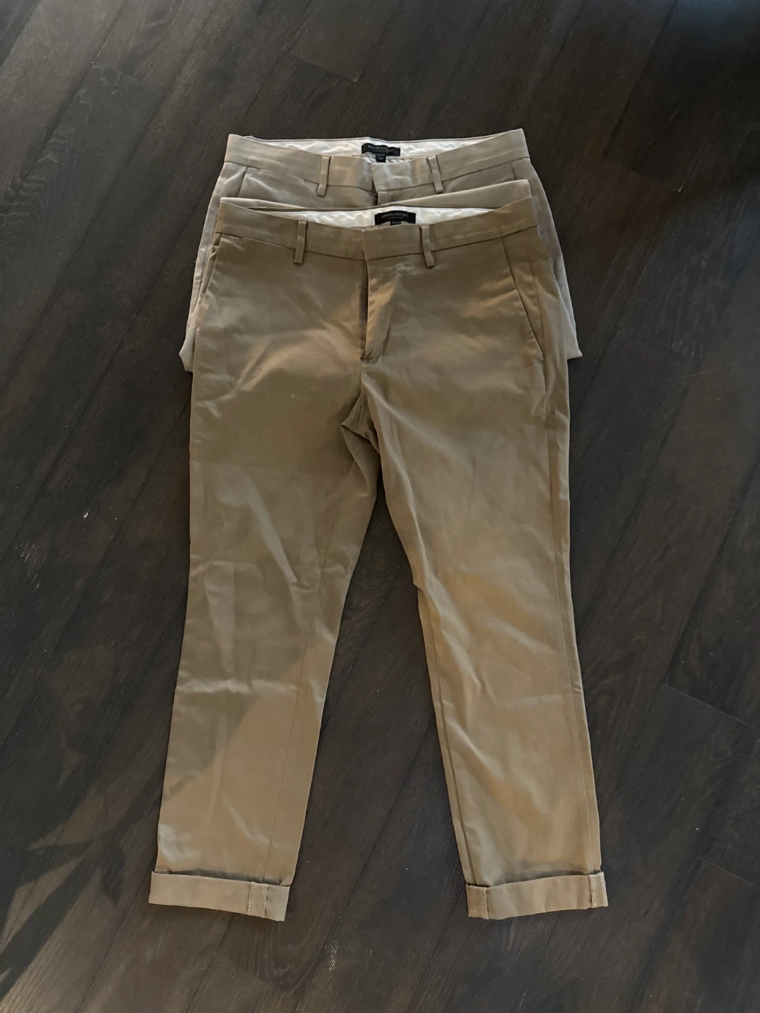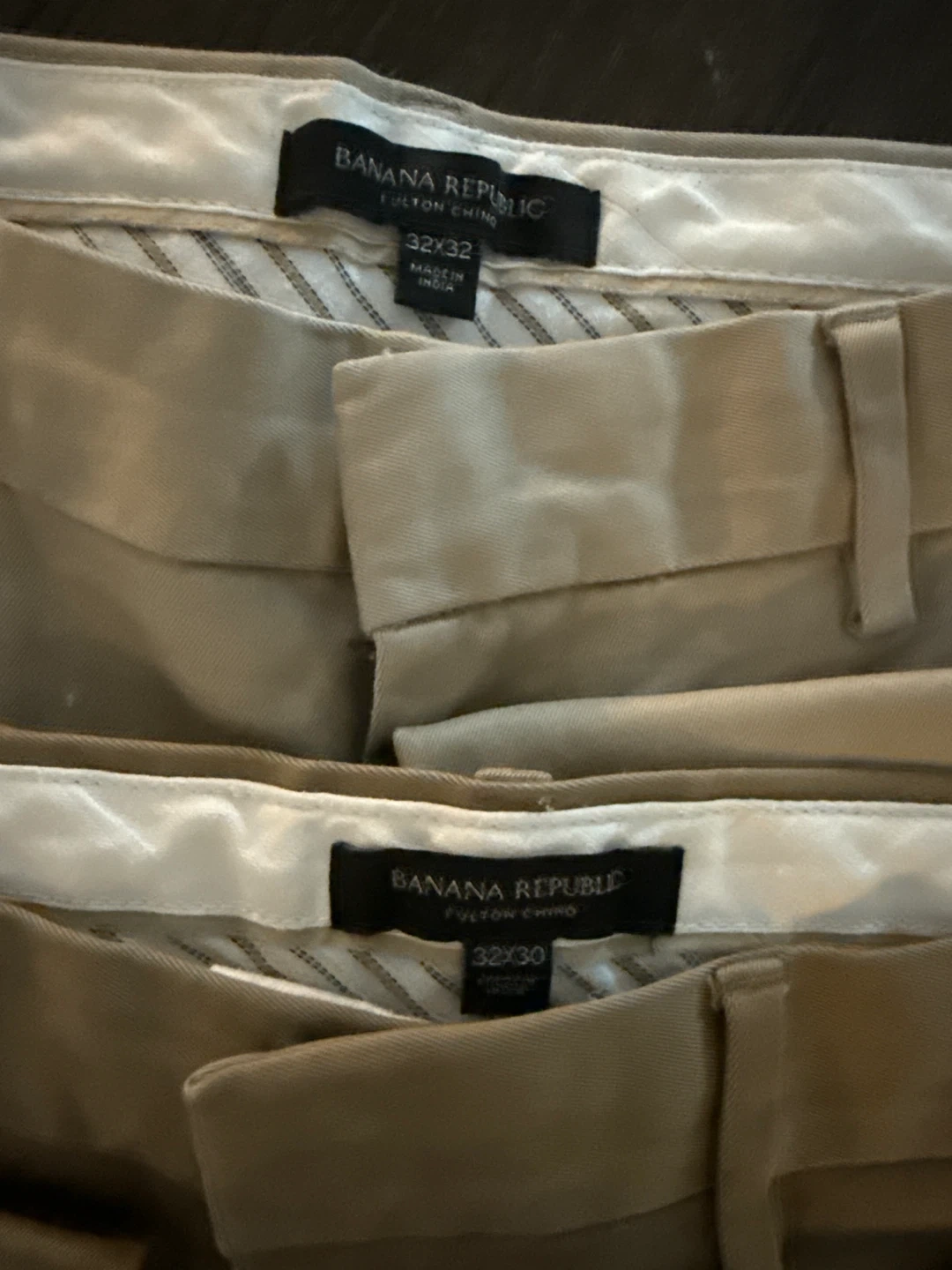 Two pairs of Banana Republic Fulton Chino pants. One pair is size 32x32 and the other is 32x30. They're a versatile khaki colour. Like new! They are too big for my husband paid $90 each take both for $10!!!!