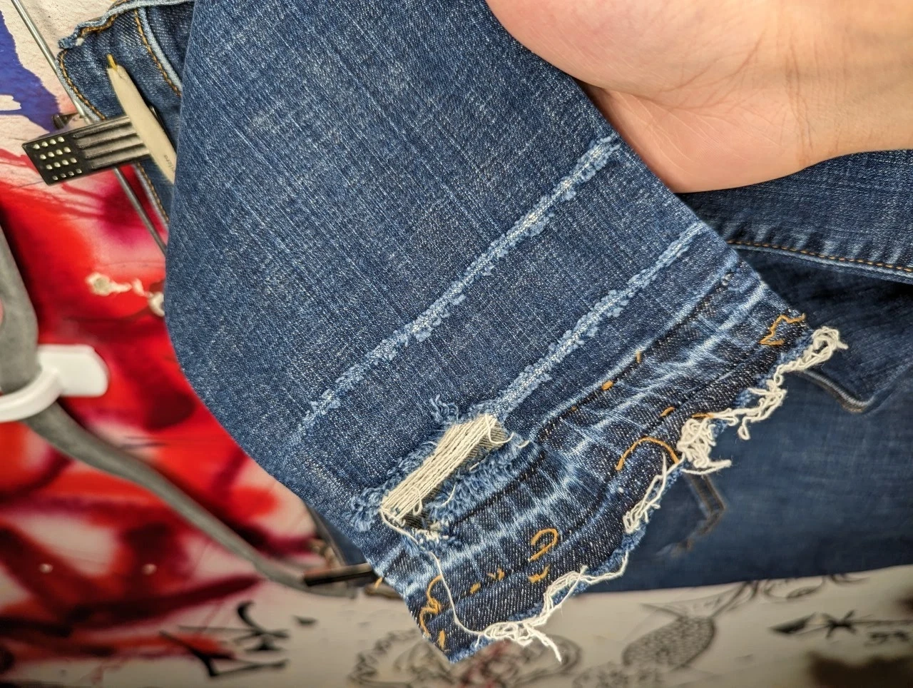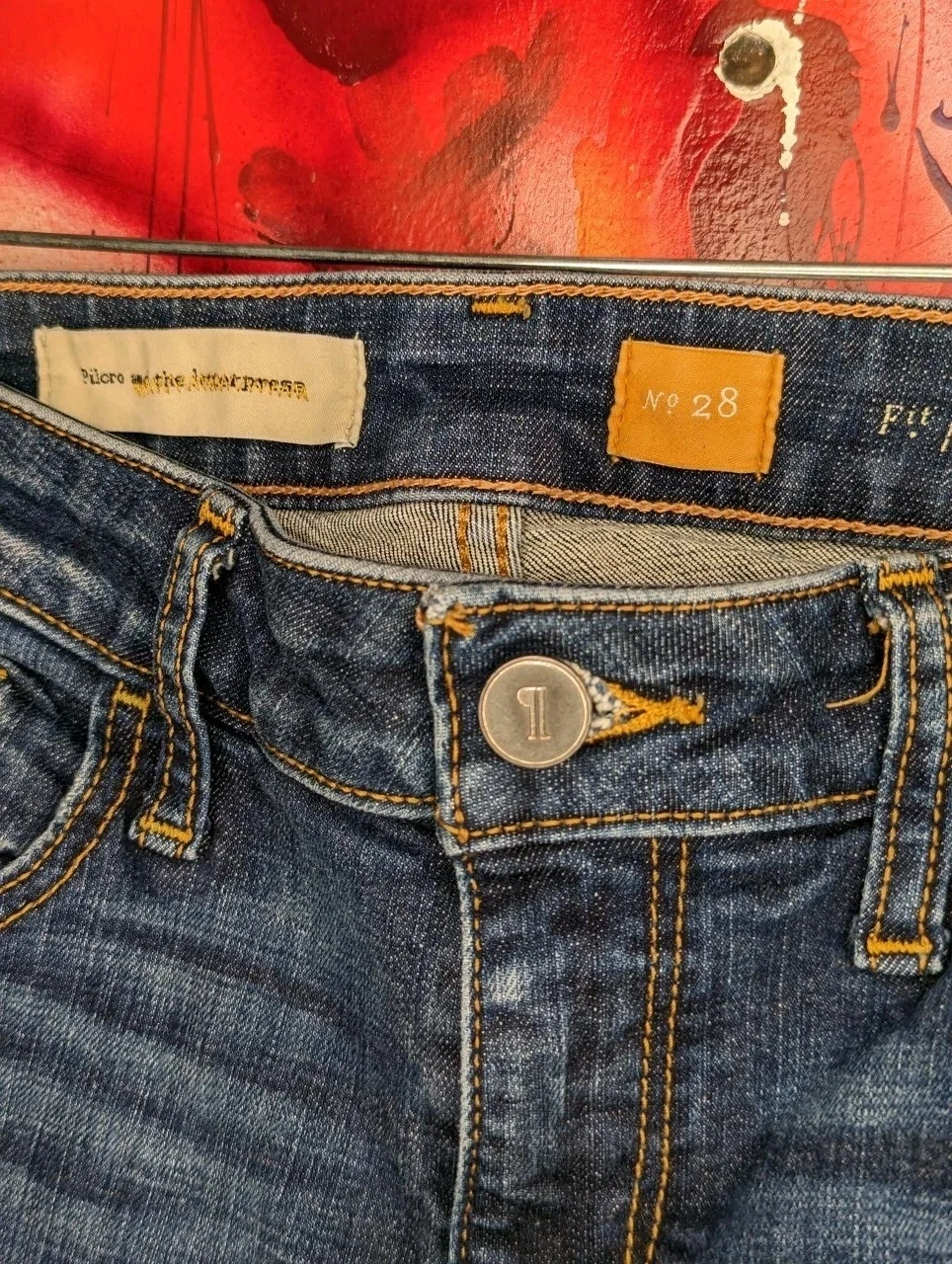 New without tags. Size 28 waist. Blue denim with a medium wash and distressed details. Features a raw hem, button and zip closure, and 5-pocket design. Slim fit, skinny style with stretch for comfort. Suitable for Fall, Winter, and Spring.