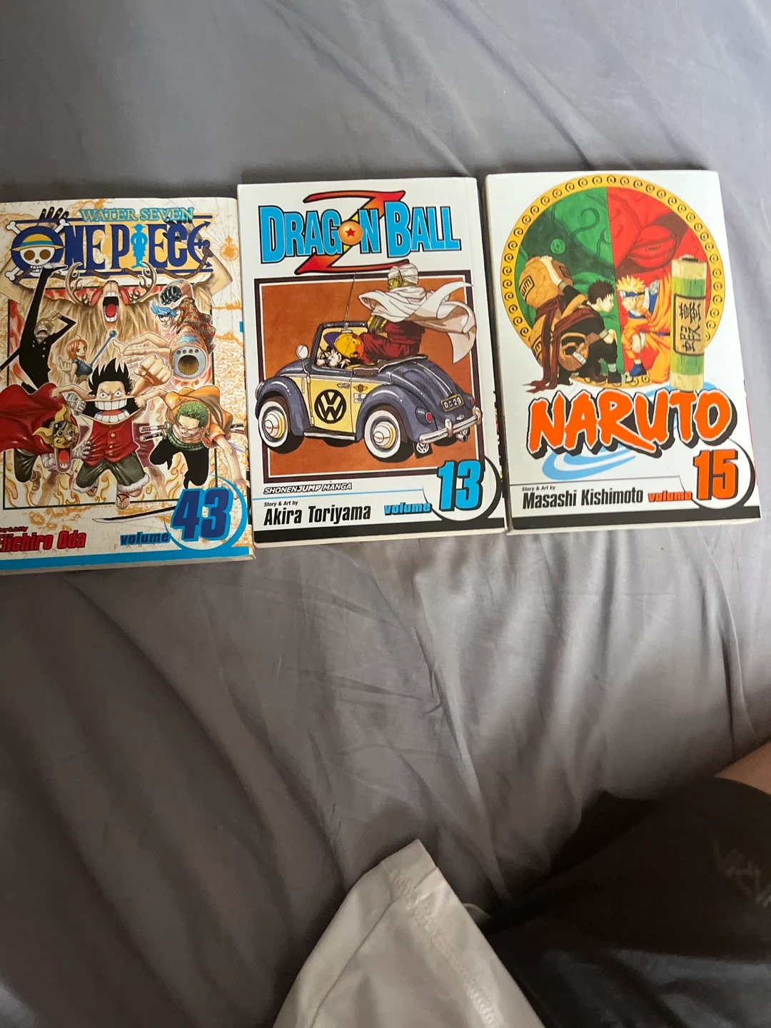 Three manga volumes are up for grabs: One Piece Volume 43, Dragon Ball Z Volume 13, and Naruto Volume 15. These are popular titles from Shonen Jump. Great for any manga collector or fan!