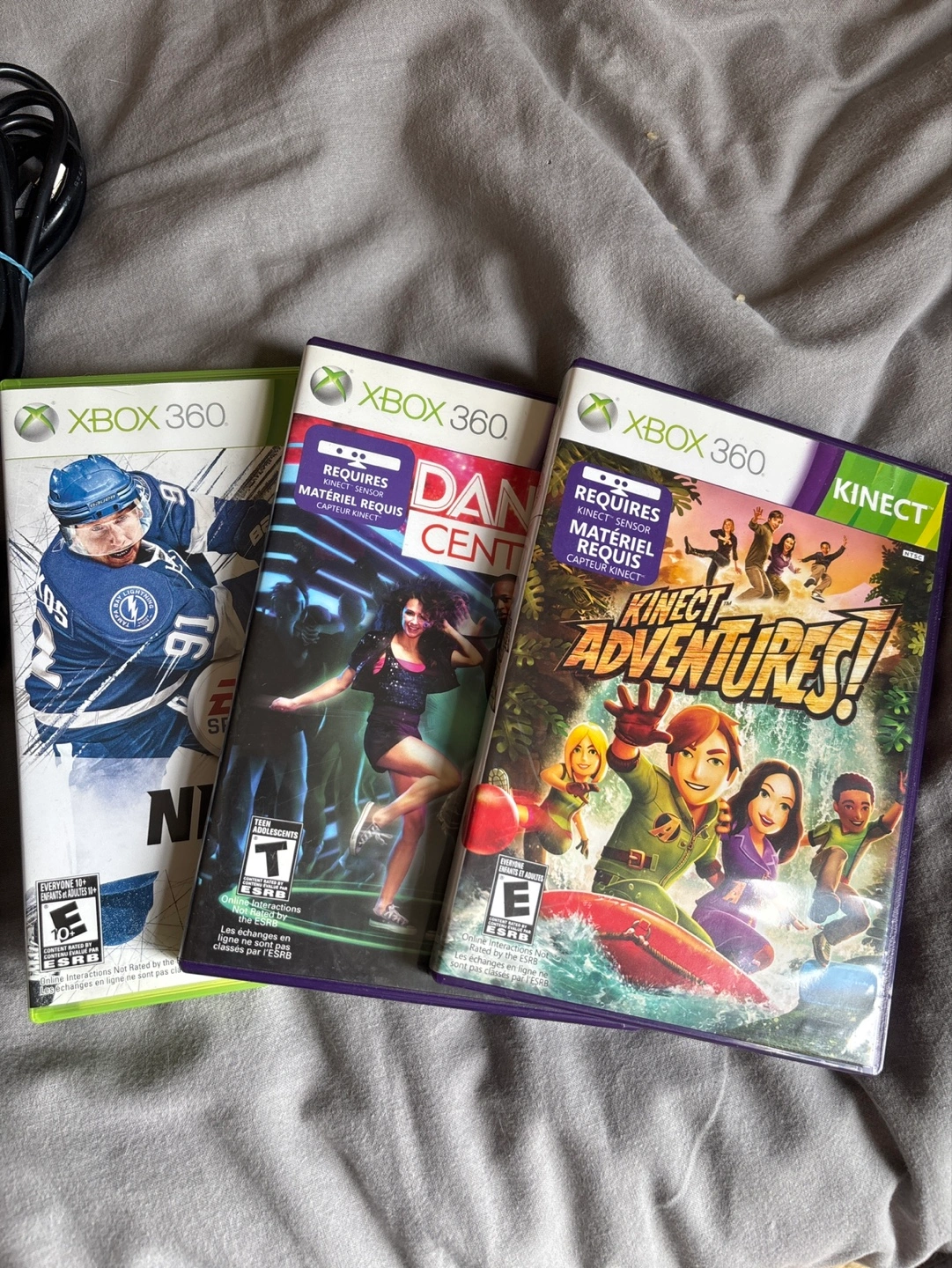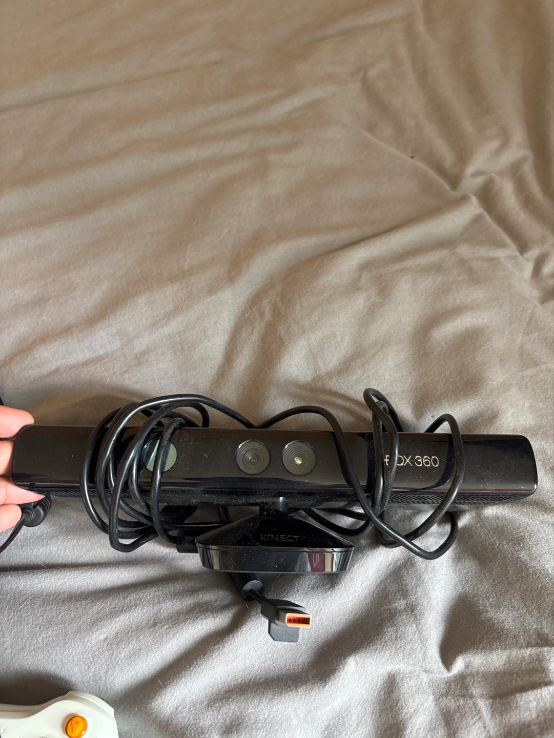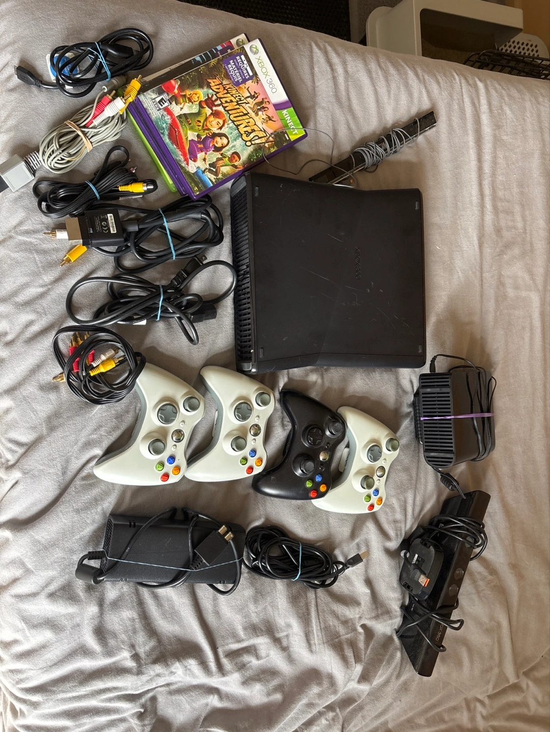 Xbox 360 console, Kinect sensor, three wireless controllers, power supply, various cables and three Kinect games included. Pre-owned, some wear and tear expected.