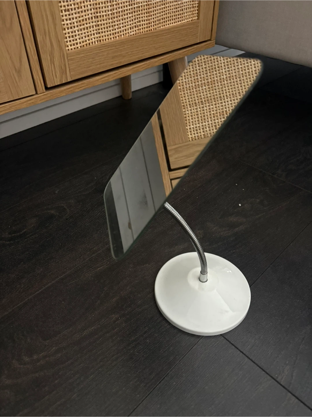 This is a gooseneck desk mirror with a white base. The flexible neck allows for easy adjustment. It's a handy size for quick touch-ups or detailed tasks.