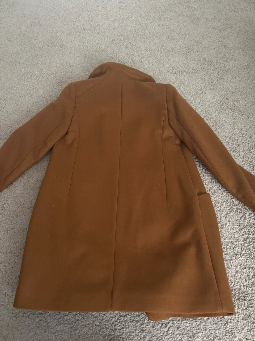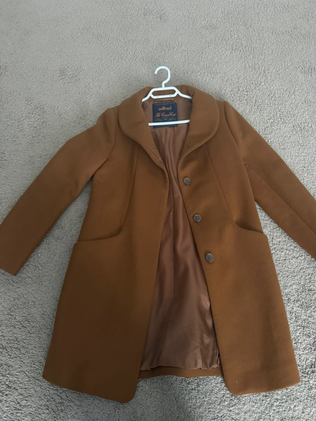 A classic Wilfred wool coat in a rich brown hue. It features a satin lining and button closure. Perfect for staying warm and stylish during cooler weather.