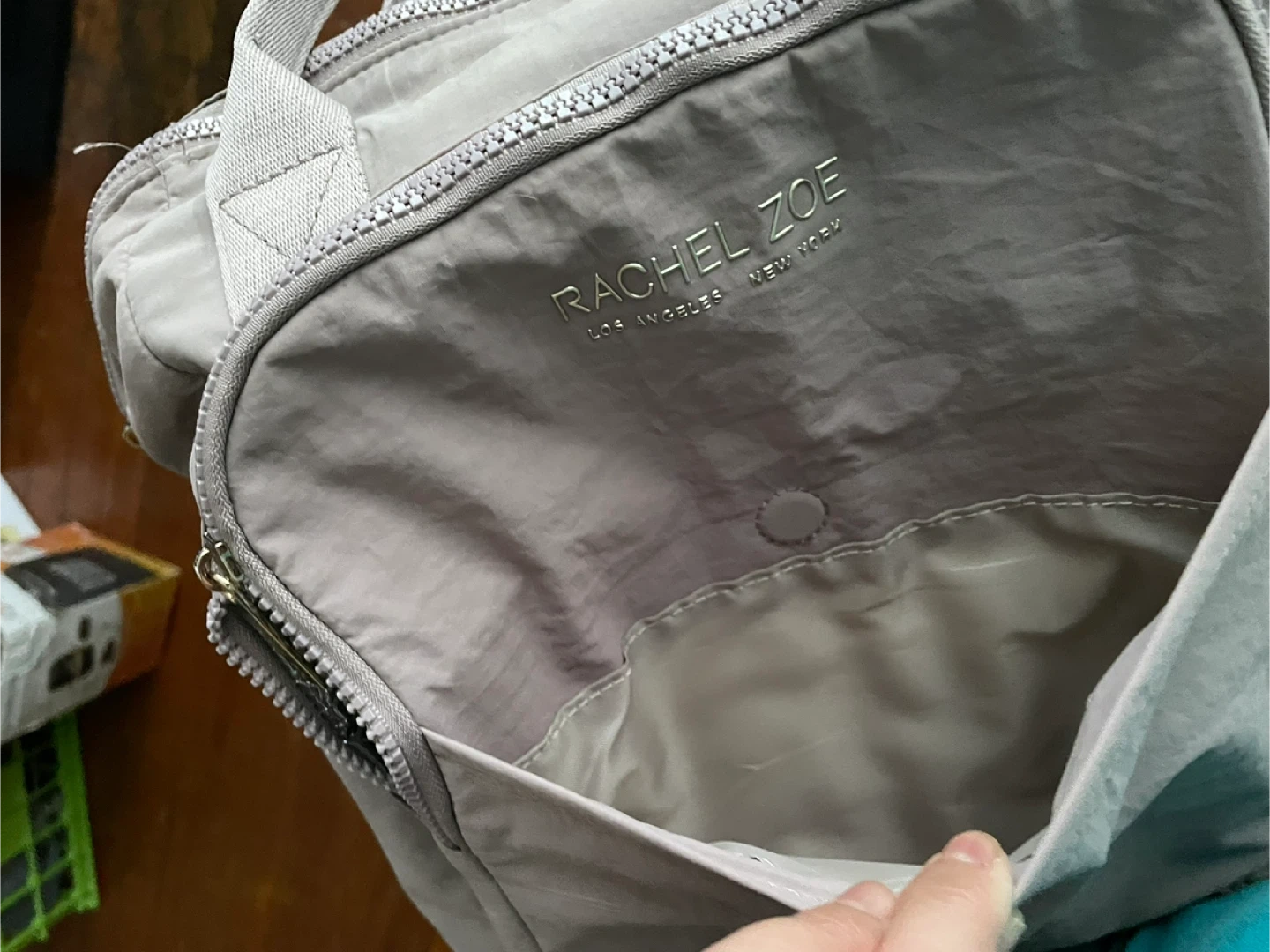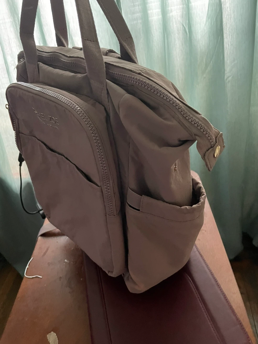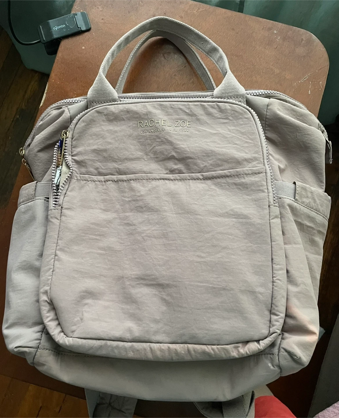 This is a Rachel Zoe backpack tote bag in a light beige color. It's made of nylon and features multiple pockets and zippered compartments. It can be carried as a backpack or a tote.