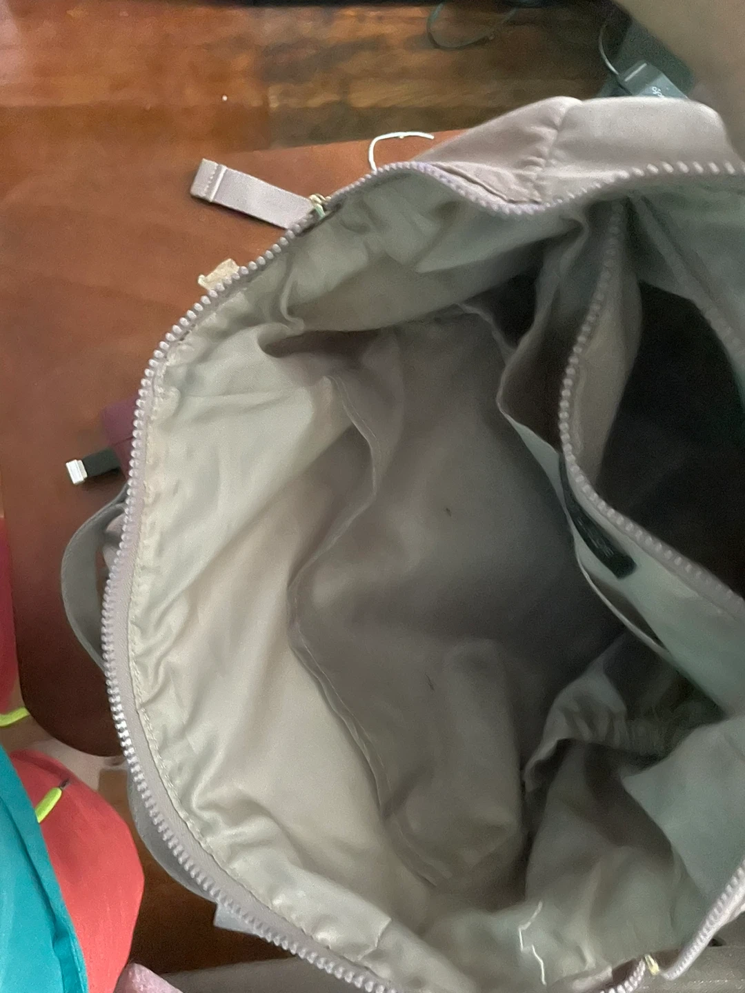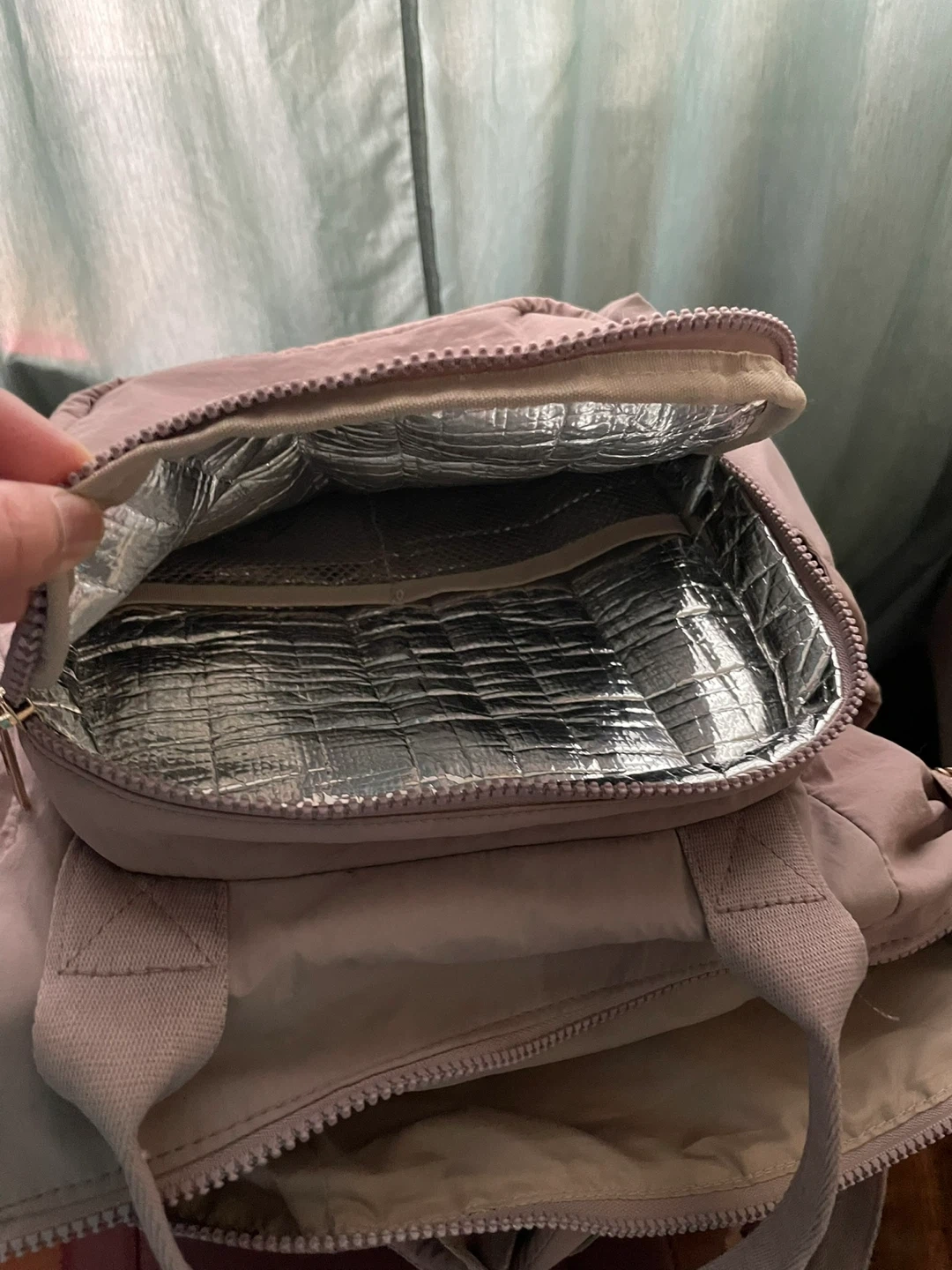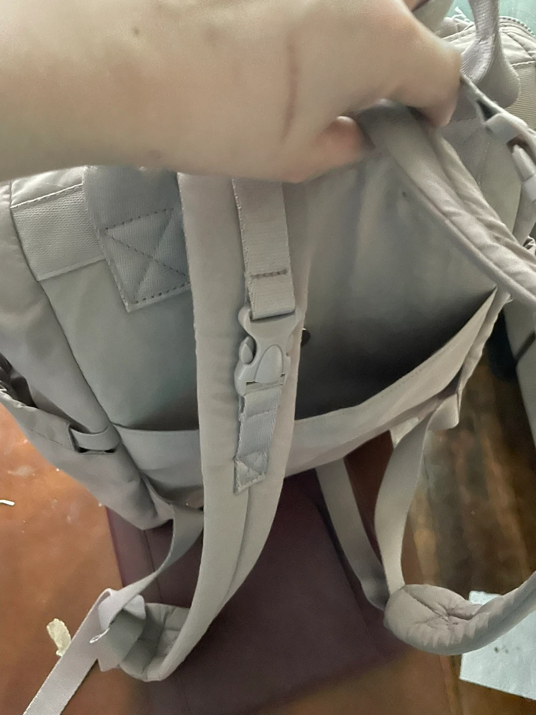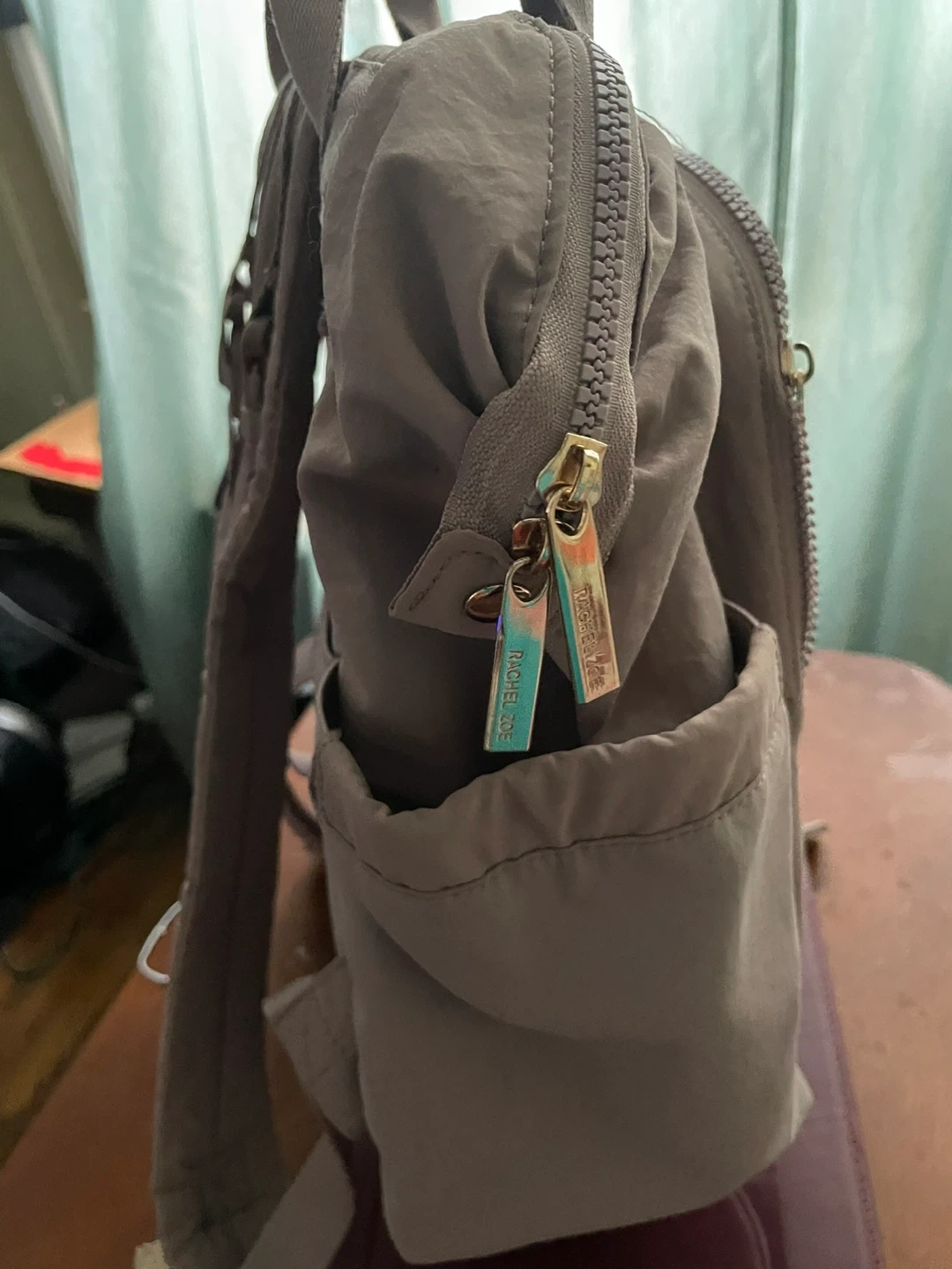 This is a Rachel Zoe backpack tote bag in a light beige color. It's made of nylon and features multiple pockets and zippered compartments. It can be carried as a backpack or a tote.