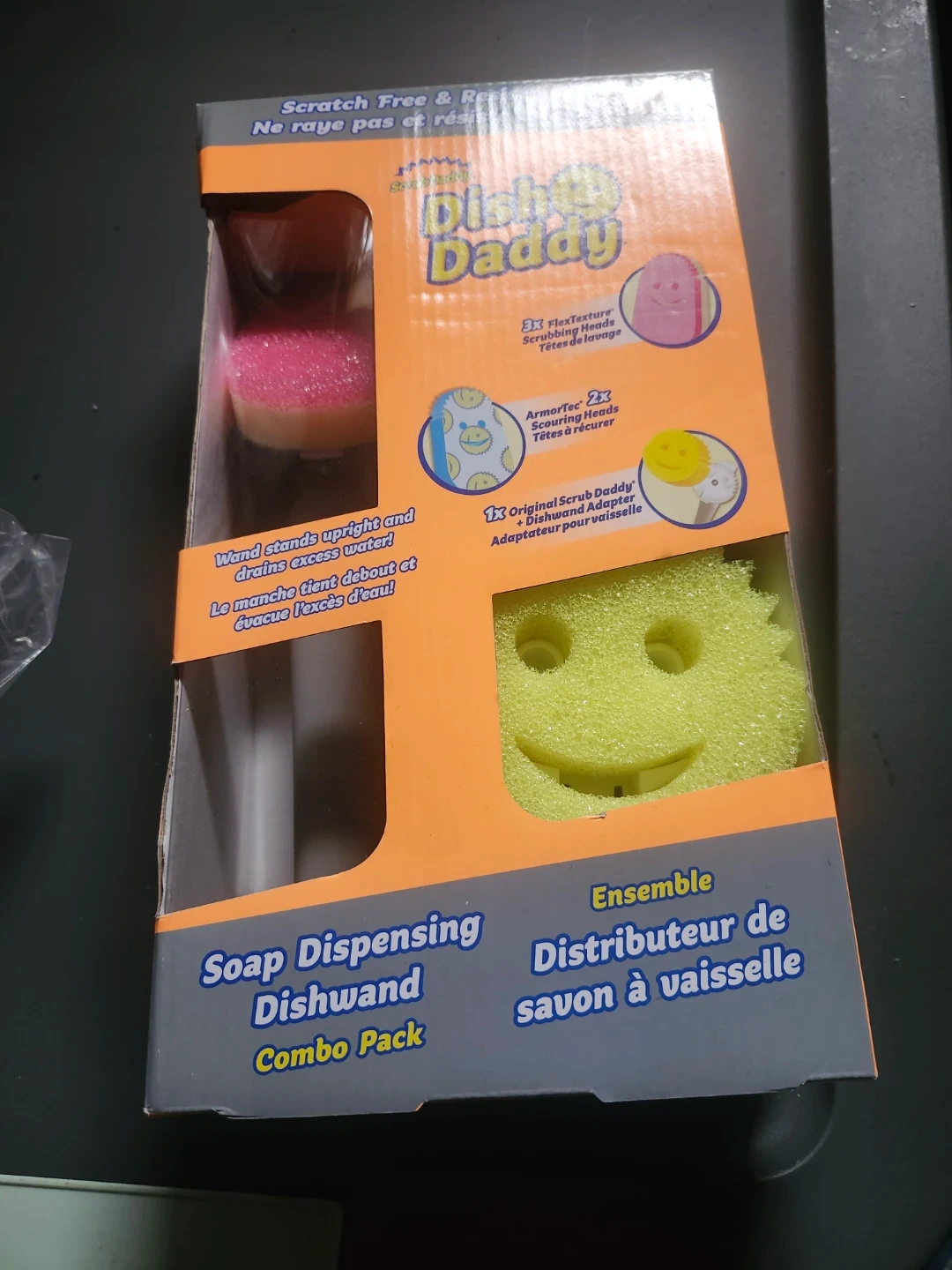 This Dish Daddy combo pack includes a soap dispensing dishwand and multiple scrubbing heads. The wand stands upright and drains excess water. It comes with 3X FlexTexture Scrubbing Heads and 2X ArmorTec Scouring Heads. The original Scrub Daddy + Dishwand Adapter is included.
