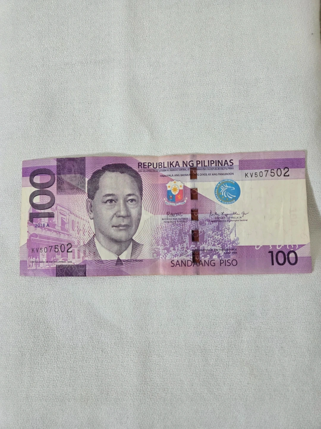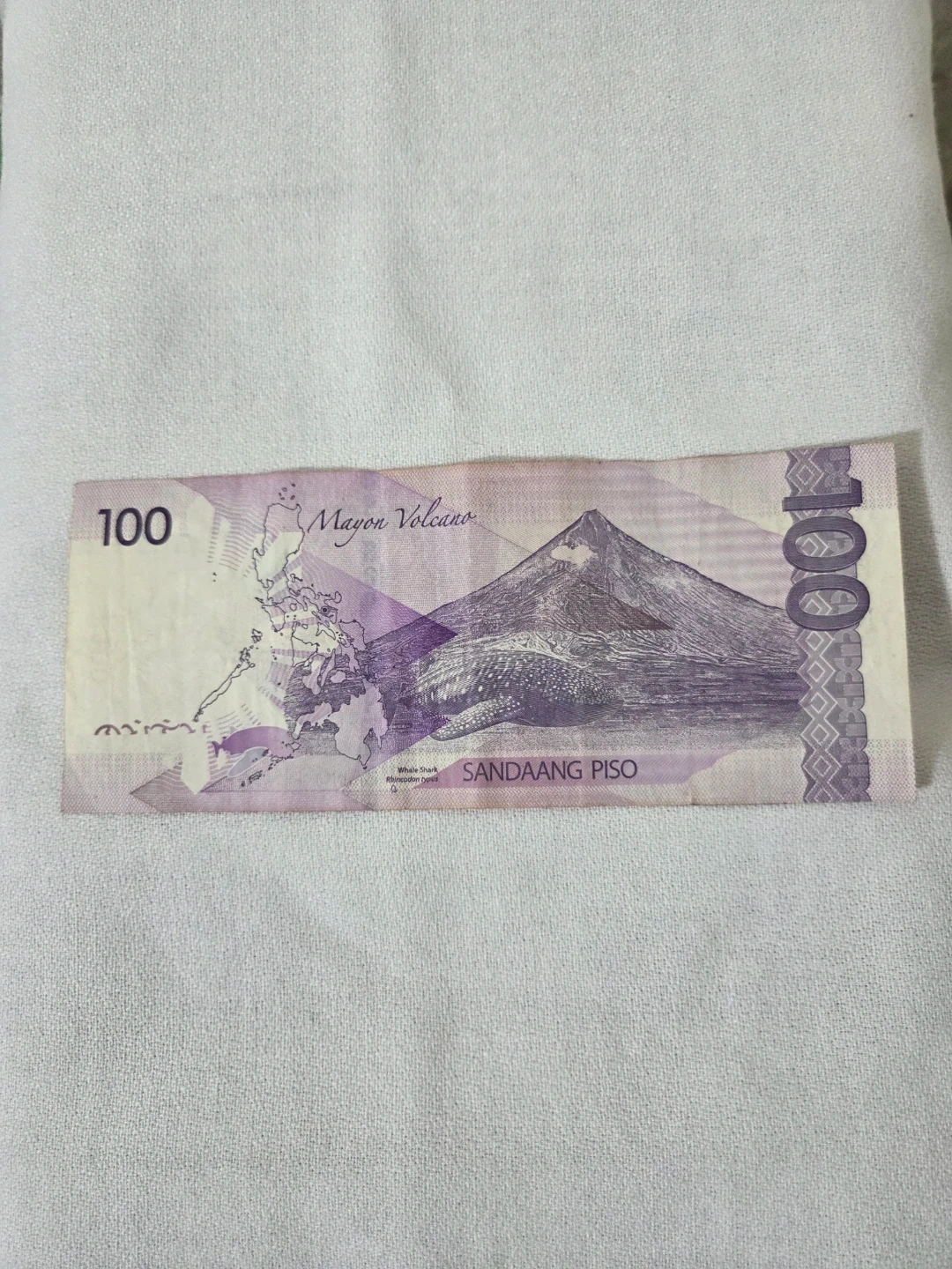 One hundred peso bill from the Republic of the Philippines. Features Mayon Volcano on one side and Manuel L. Quezon on the other. This currency is a nice addition for collectors.
