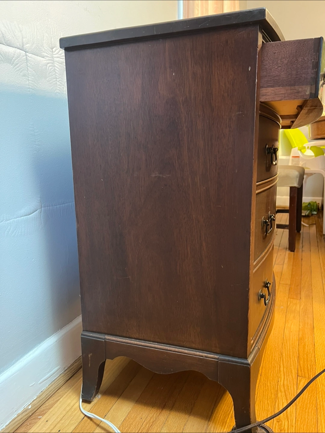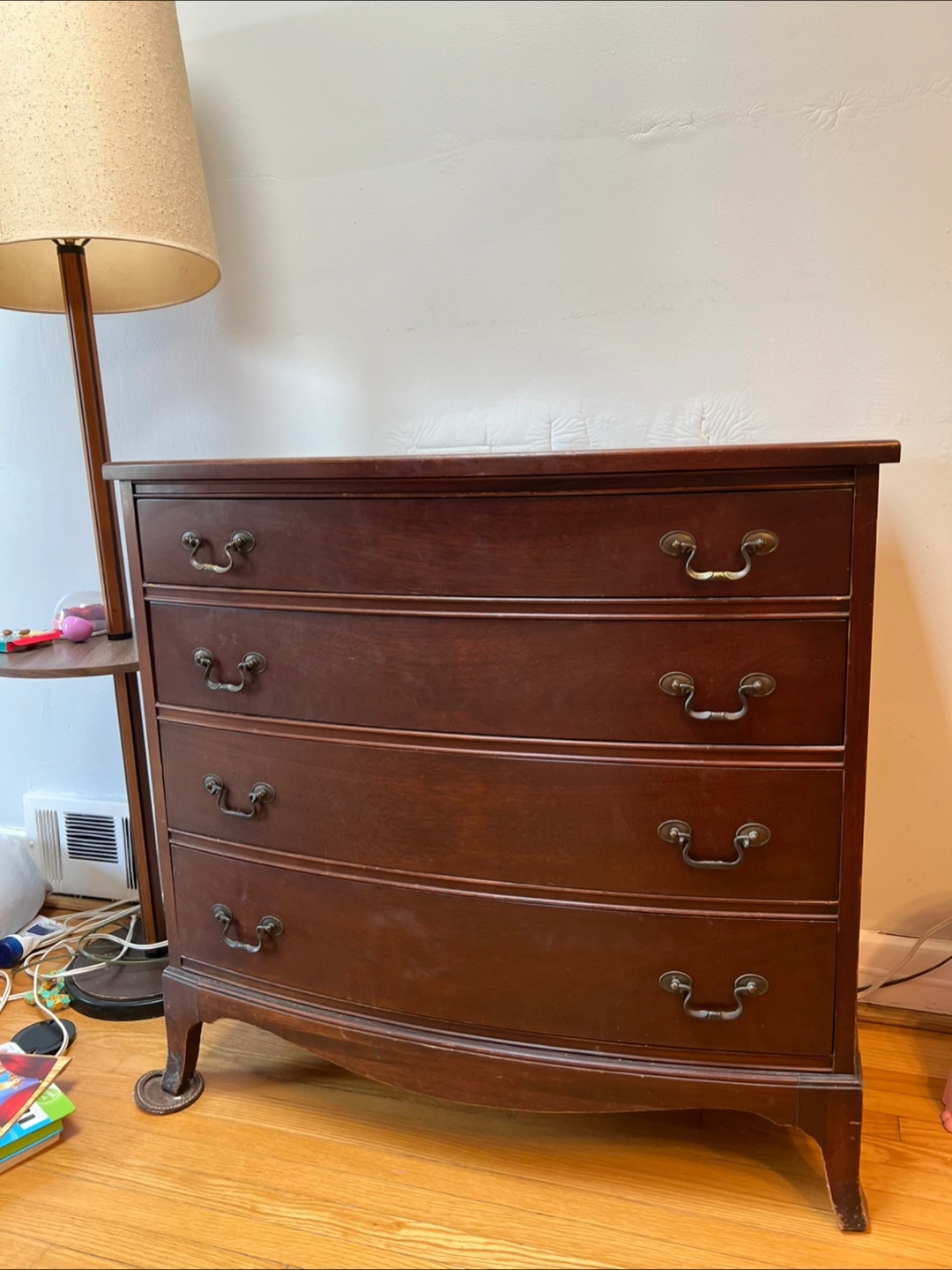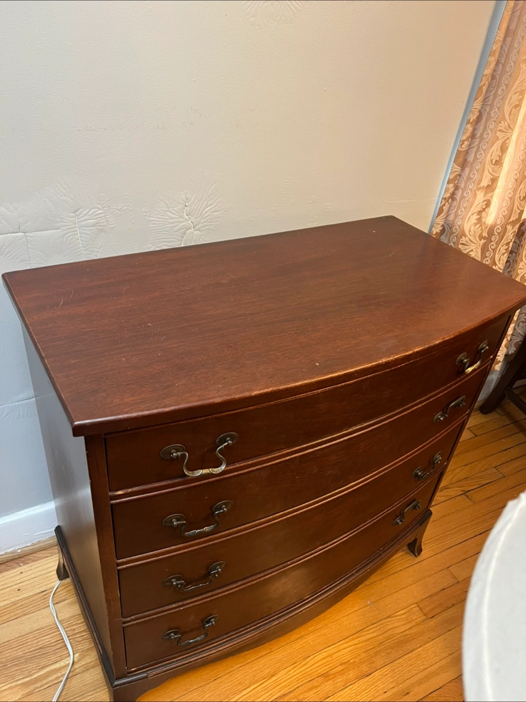 Here's a lovely Mahogany wooden dresser that could be perfect for your bedroom or living space. It features a classic design with curved drawer fronts and antique-style handles. It shows some signs of use, but it's still sturdy and functional
