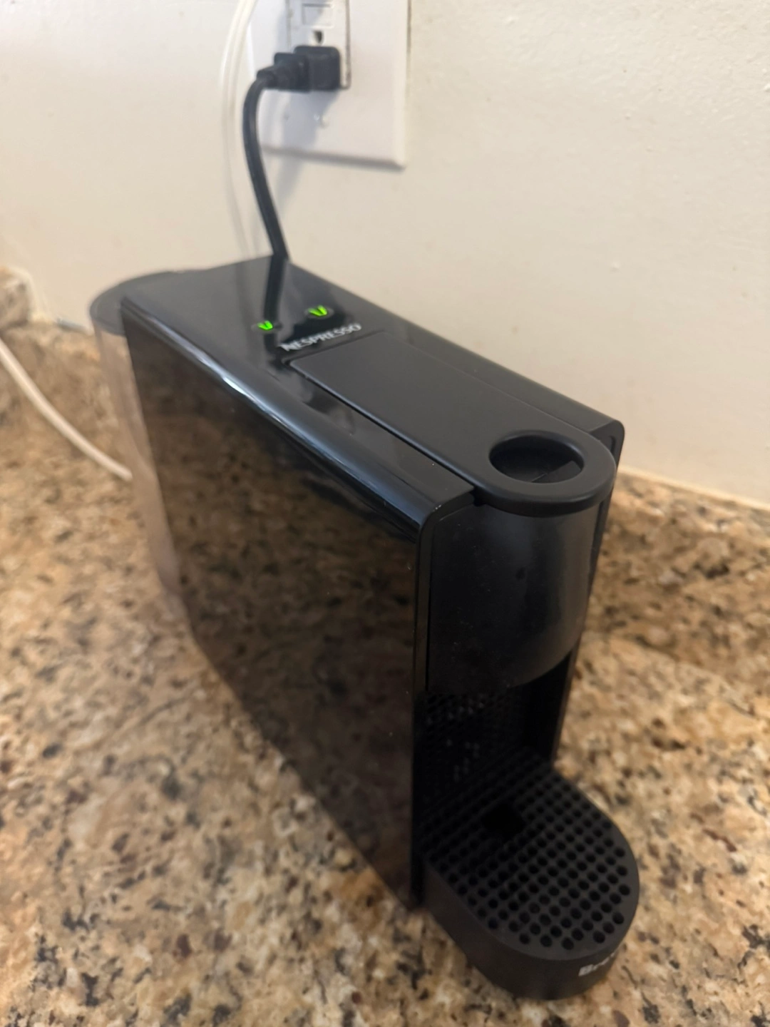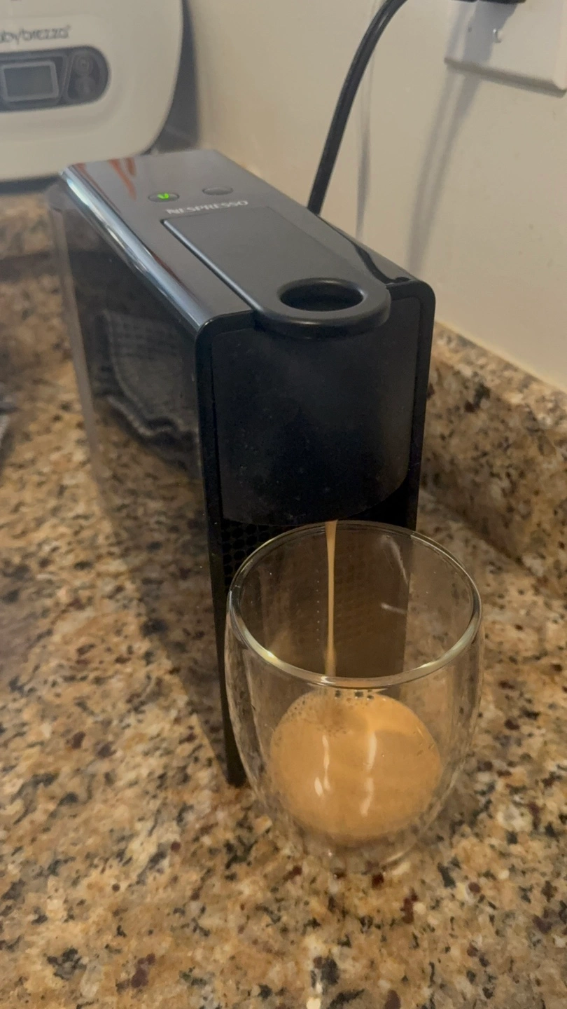 A black espresso machine. The espresso machine has a water reservoir and a used pod receptacle. Consider enjoying a cup of espresso when you are waking up, it will make your day better