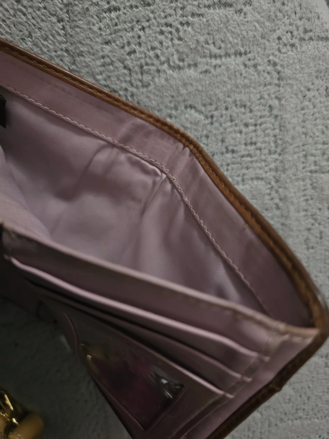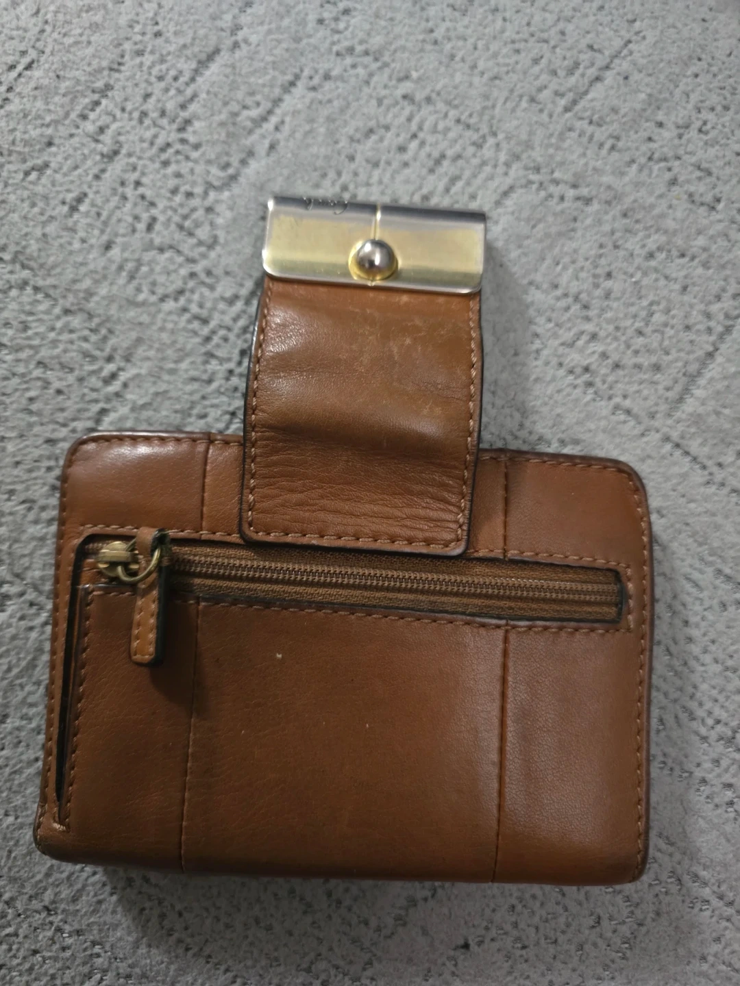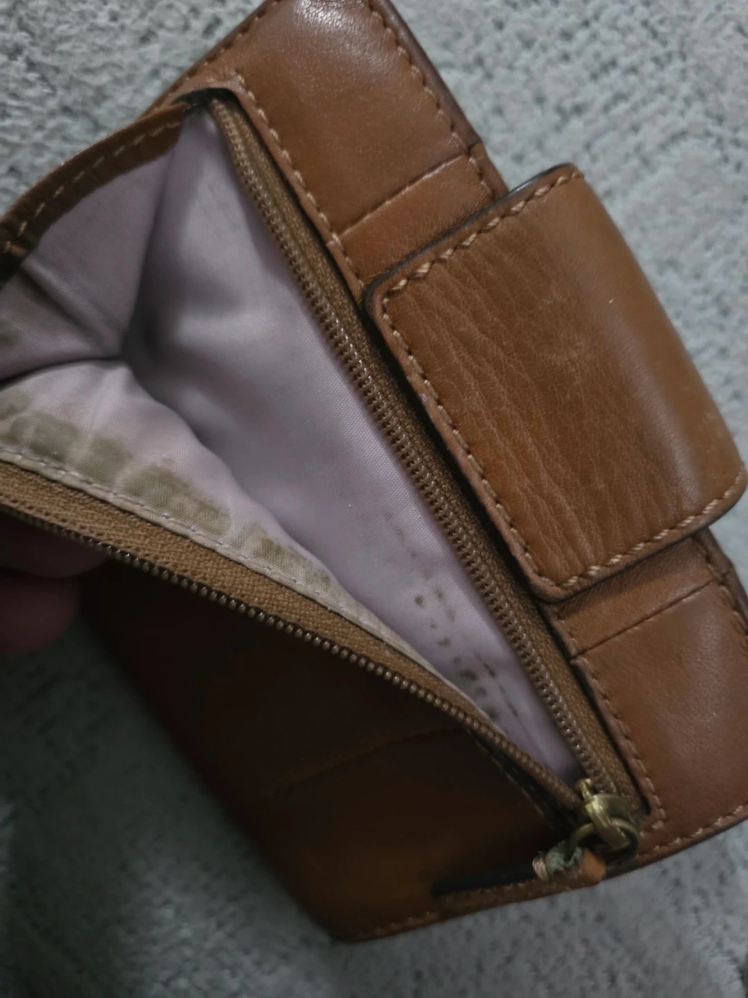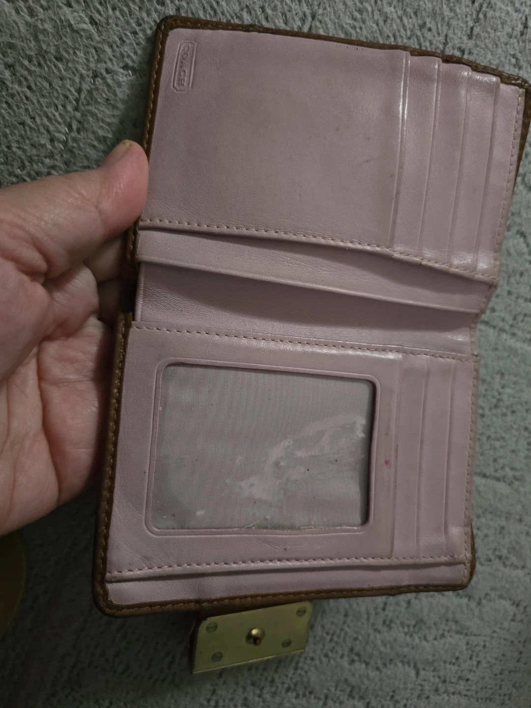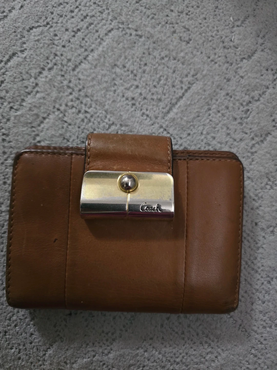 Brown leather bifold wallet from Coach. It has a snap closure and a zippered coin pocket. Interior features multiple card slots and an ID window. The stain is from coin slot is it's own glue.