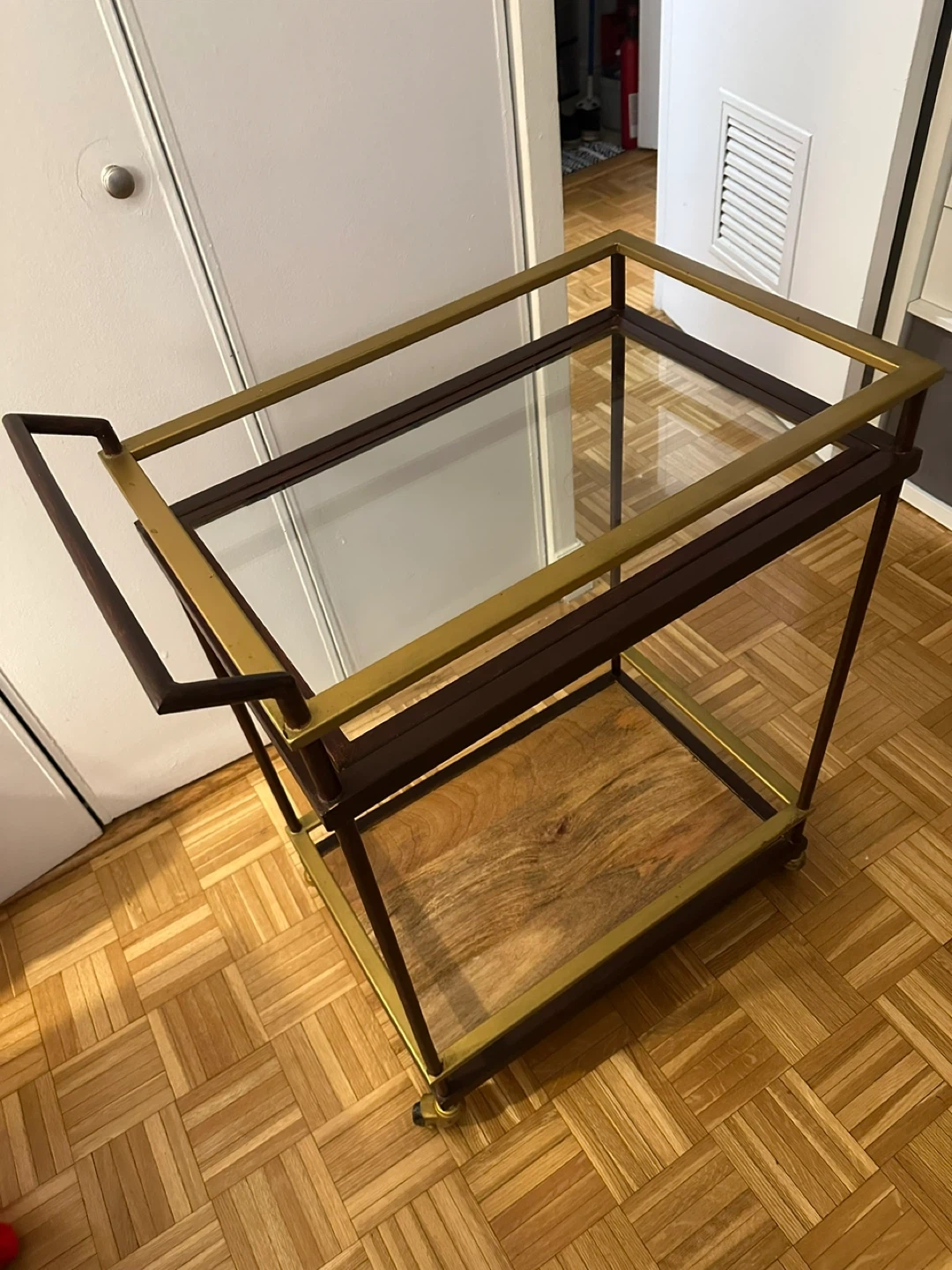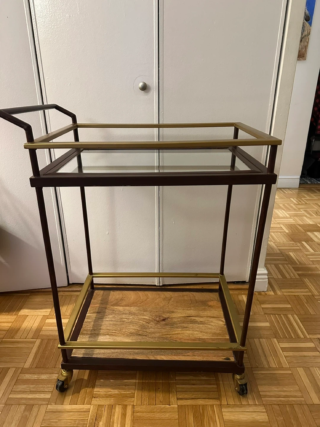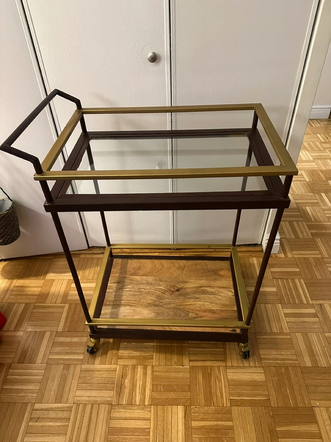 I'm selling a stylish bar cart that's perfect for entertaining or adding a touch of elegance to your home! It features a combination of glass and wood shelves, providing a sophisticated look. The cart is in great condition and ready to be used in your home