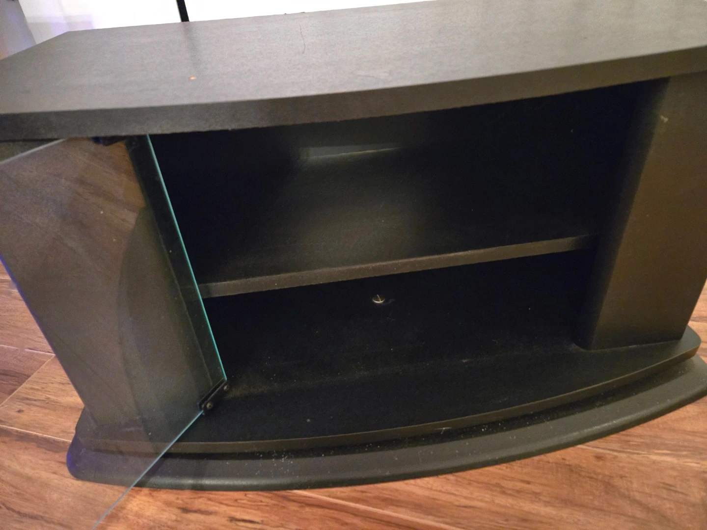 Selling a black TV stand with a glass door. It has a shelf inside for storage. It swivels! It's in good condition and ready for a new home! Length 67cm, Depth 40cm, Height 36cm