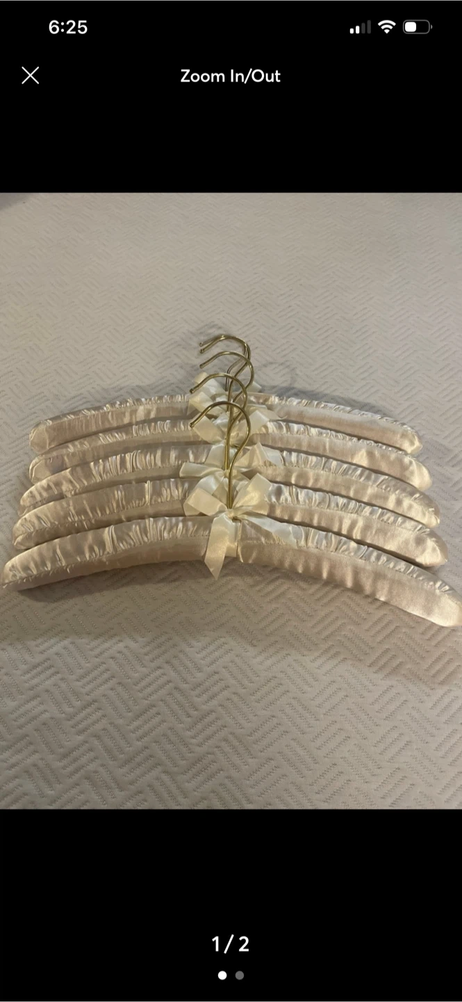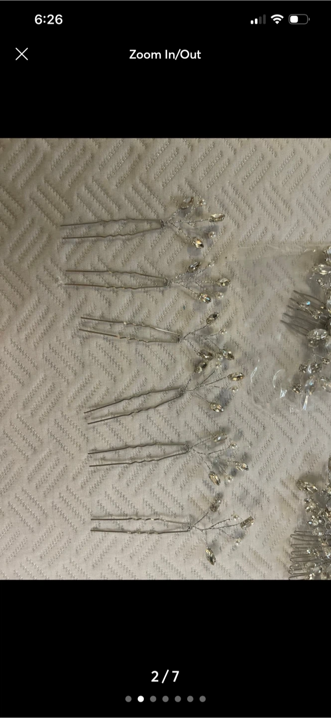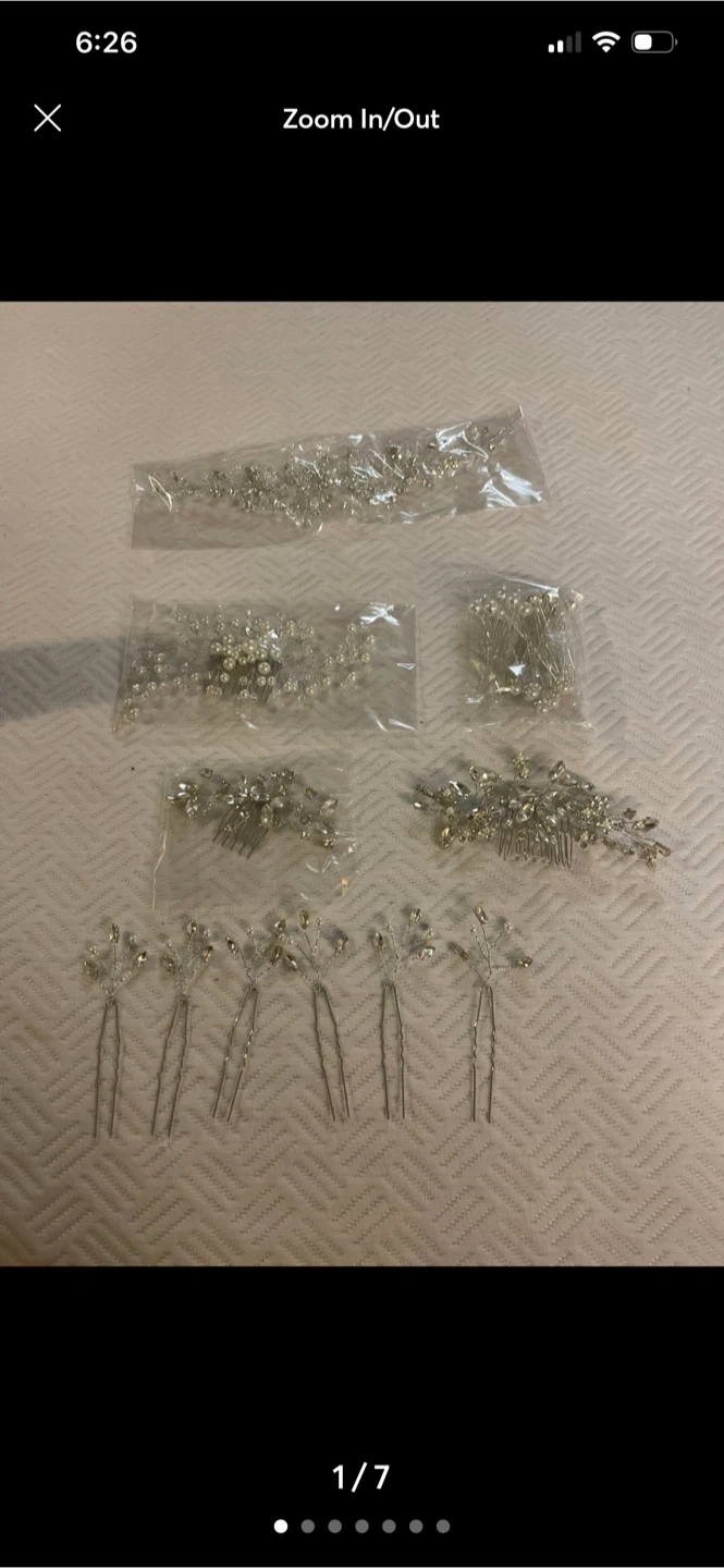 This set includes various sparkling bridal hairpins and combs adorned with rhinestones and faux pearls. It also comes with a satin "Bride" fanny pack in a cream color with gold accents. A set of satin hangers with bows is also included.