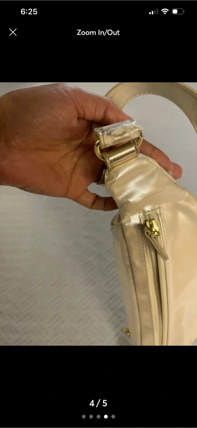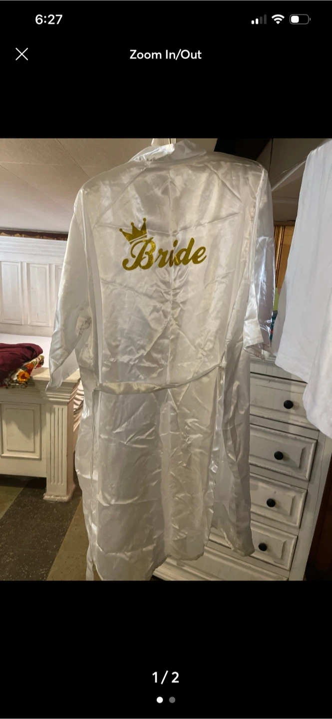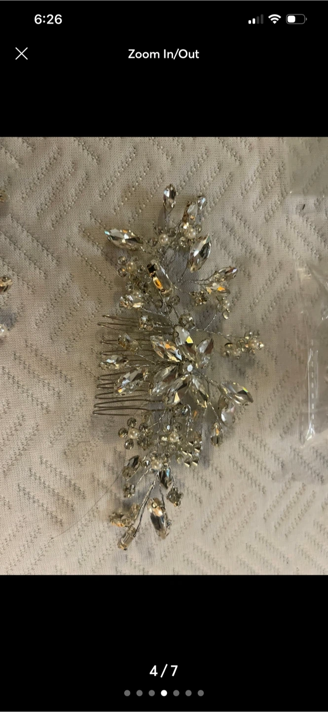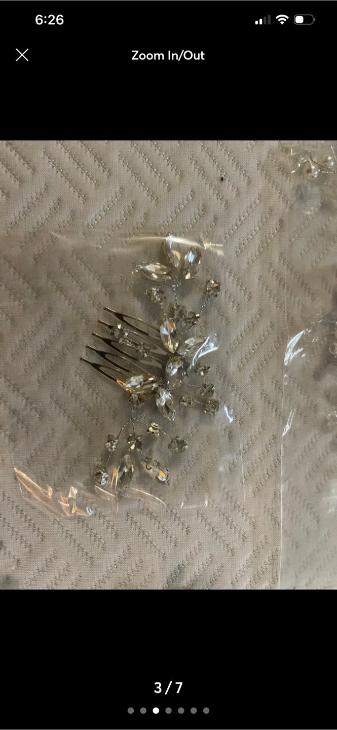 This set includes various sparkling bridal hairpins and combs adorned with rhinestones and faux pearls. It also comes with a satin "Bride" fanny pack in a cream color with gold accents. A set of satin hangers with bows is also included.