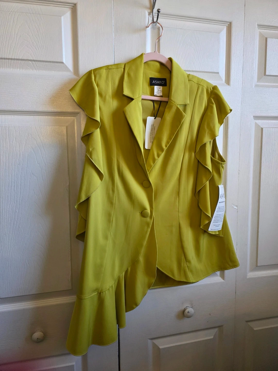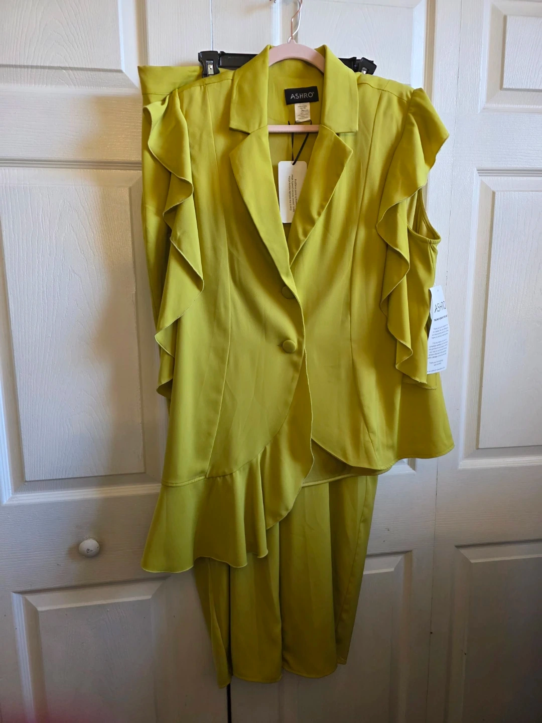 Selling a beautiful Ashro pant suit in a unique chartreuse color! This set includes a ruffled blazer-style top and a matching pants both in size 16W. Perfect for a special occasion or adding a pop of color to your wardrobe