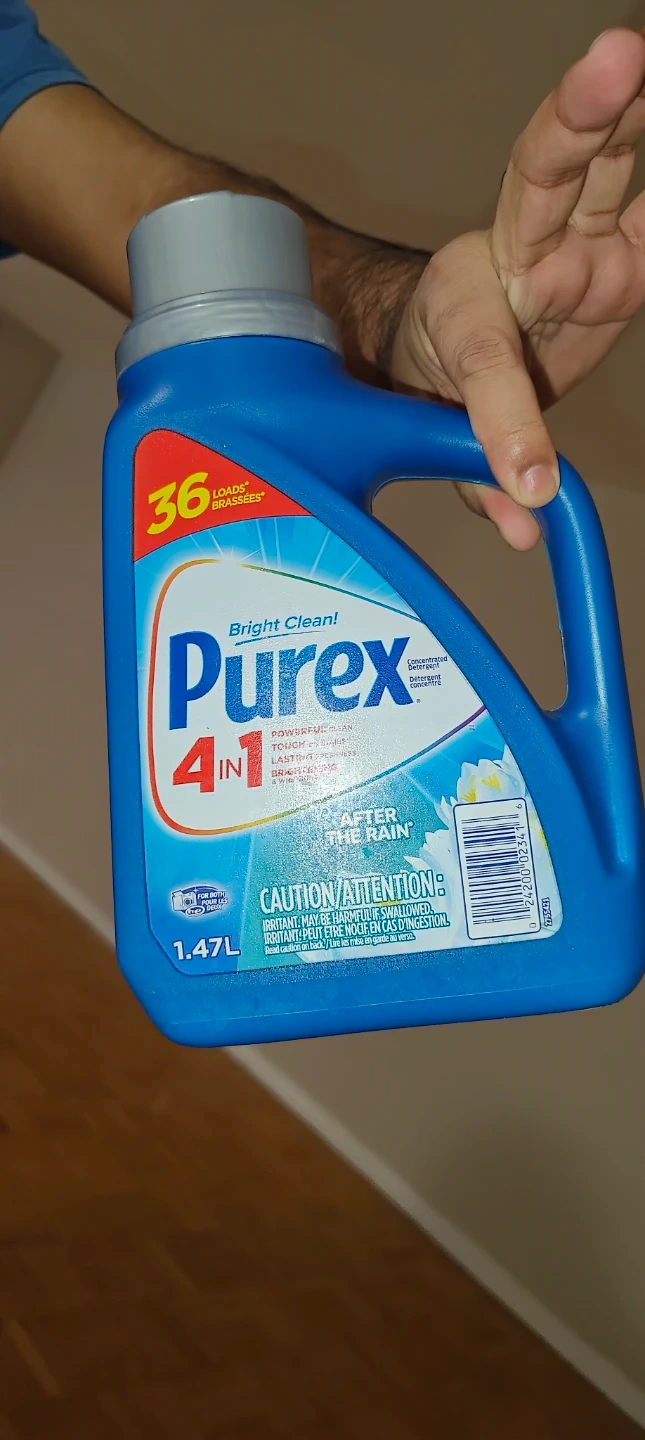 Selling a bottle of Purex 4 in 1 laundry detergent. This is the 'After the Rain' scent and comes in a 1.47L bottle. Provides 36 loads of washing power!