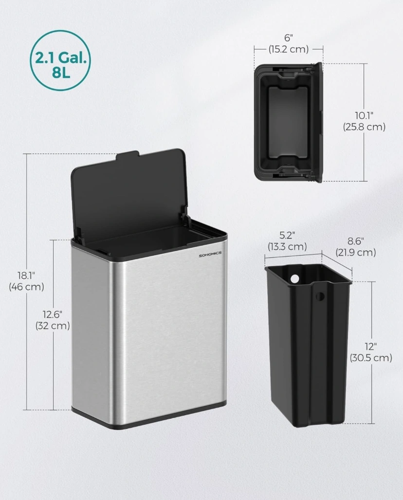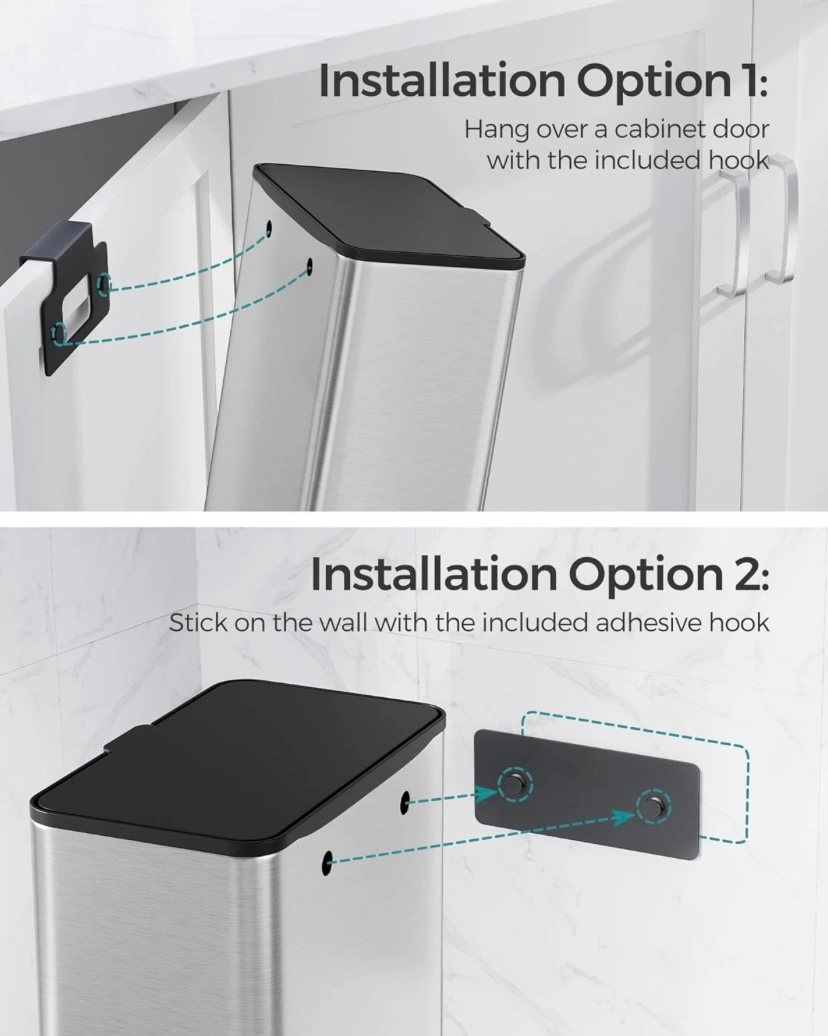 Rarely Used, Hanging Aluminum Trash Can with Interior Bin, Light and Easy to Clean, 2.1-Gallon (8 L) Kitchen Garbage Can with Lid, Cabinet Door Hanging or Wall-Mounted with Hooks, for Under Sink, Bathrooms, Metallic Silver.