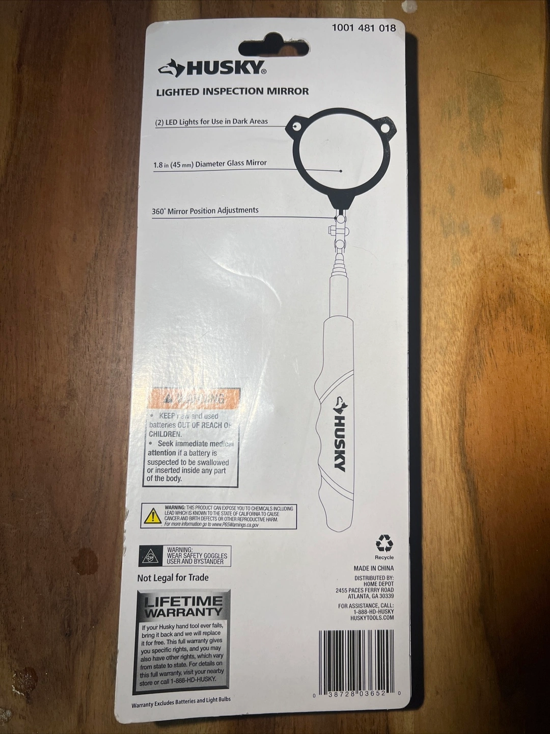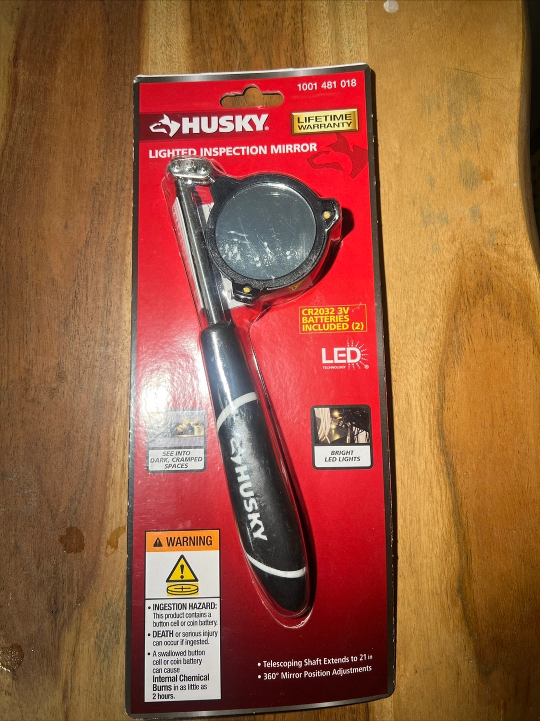 LED lighted inspection mirror. Telescoping shaft extends to 21 inches. 360° mirror position adjustments. 1.8 in diameter glass mirror. Bright LED lights for use in dark areas. Includes 2 CR2032 3V batteries.