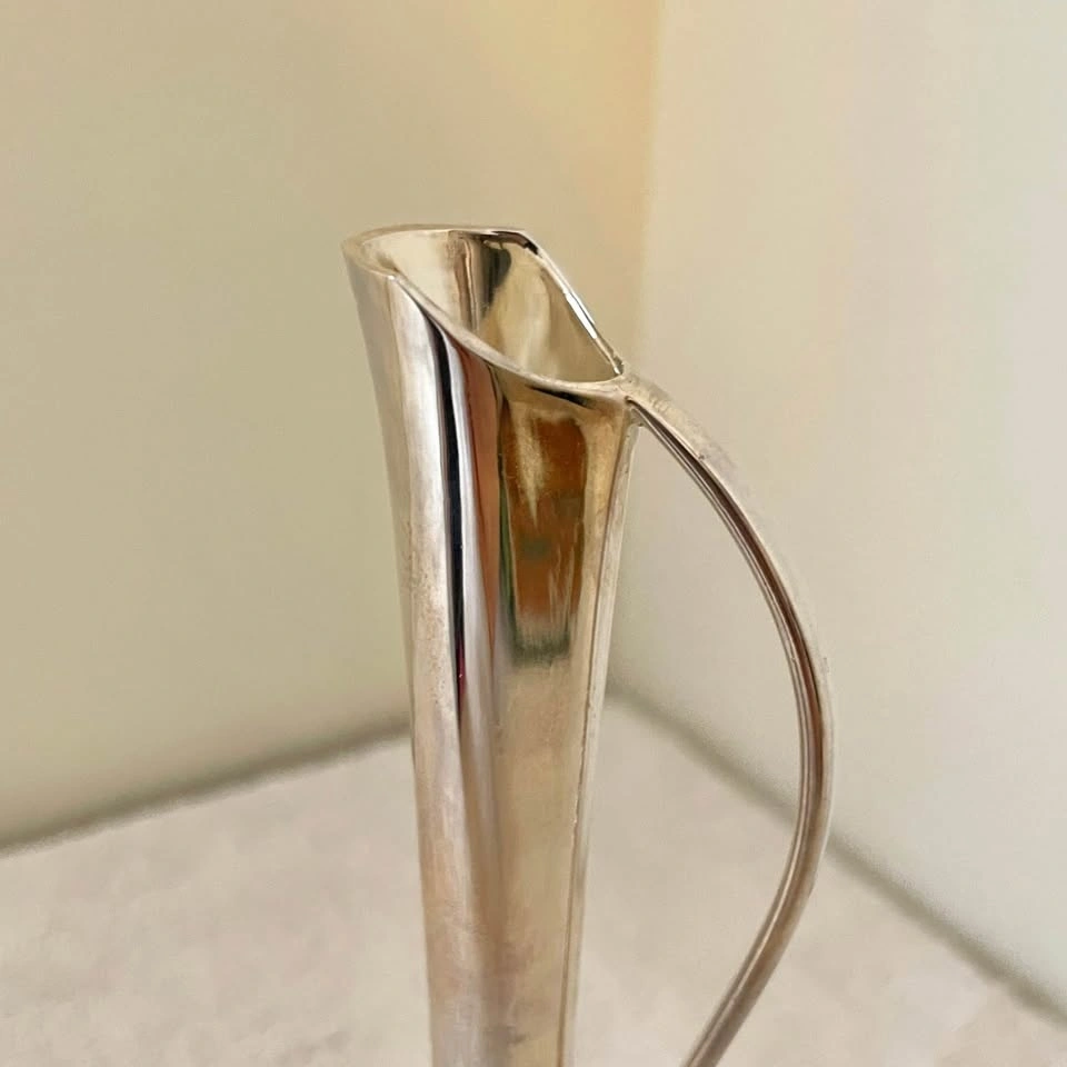 Beautiful silver-plated bud vase featuring a sleek, modern design with a curved handle and a charming gold-toned bow accent at the base. Perfect for displaying a single stem or small floral arrangement.